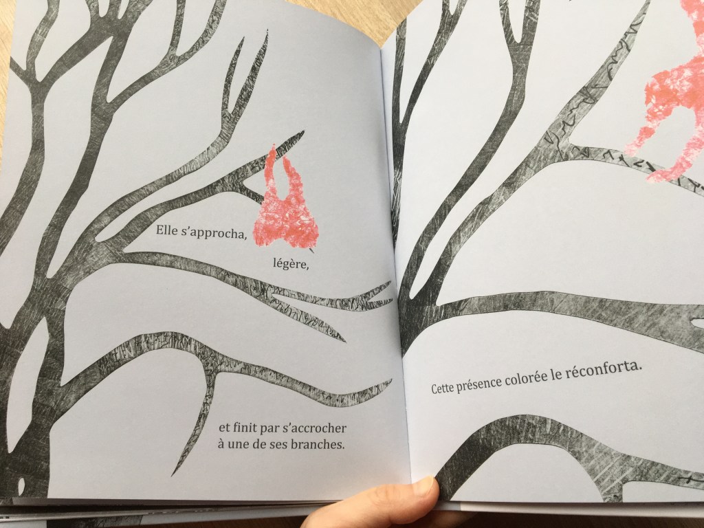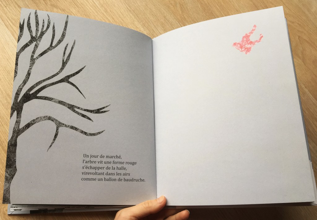 Au moment de l’hiver, plus rien ne semble pouvoir égayer l’arbre de la ville. Il s’en persuade jusqu’à ce que dans toute cette grisaille, une tache colorée retienne son attention. Quelle chance que cet objet rouge vif qui virevolte à proximité des longues branches. Voilà qu’il s’y accroche. Voici l’arbre réconforté d’être paré d’un sac en plastique !