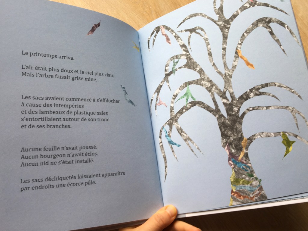 Une vie sans plastique, l’arbre l’a compris, ça laisse de la place à la vie. Les bruissements des sacs ont laissé place aux pépiements. Luna Granada offre à son arbre et au lecteur la joie de la renaissance sur fond de ciel bleu !