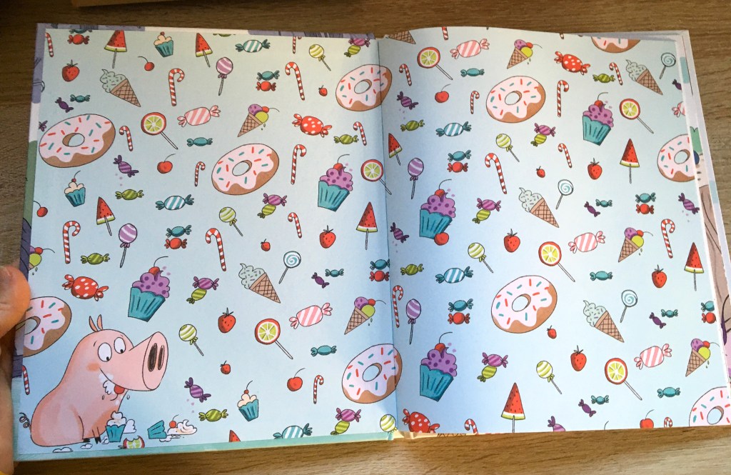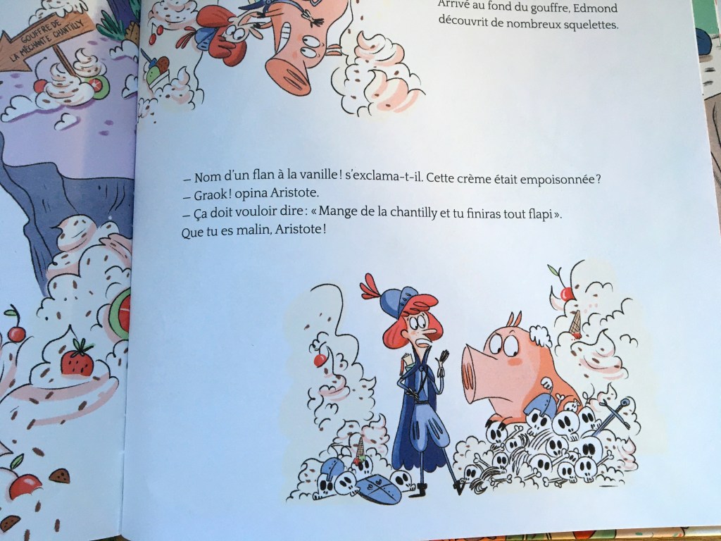 Le voici donc parti, chevauchant fièrement son cochon, étudiant sérieusement la carte de l’empire du sucre maléfique et ses terribles contrées. Bien lui en prend car le parcours est semé d’embuches toutes plus collantes, sucrées et terrifiantes les unes que les autres : lac du Caramel maudit, gouffre de la Méchante Chantilly, précipices des Sucettes tranchantes…On se croirait dans une annexe de la maison en pain d’épices de la sorcière d’Hansel et Gretel !