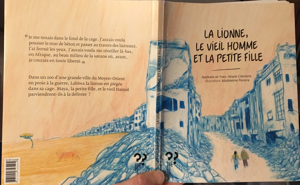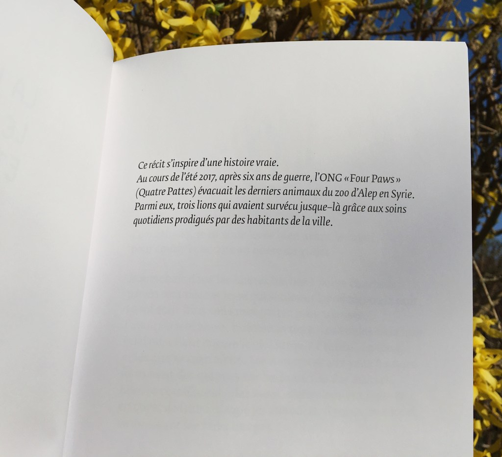 Pour moi, quelques larmes à la lecture de l’eau qu’Hamid donne à la lionne : la simplicité de ce geste n’a d’égal que la grandeur d’âme qu’elle recouvre. Oh que cela m’a émue…Quand le chaos règne, quand l’humanité semble en totale déroute, pourquoi continuer à vivre ? Hamid est vieux, malade et sa famille a fui la guerre. Le malheur de la lionne et l’injustice de sa situation sont parvenus jusqu’à lui. Humain, animal, tout à la même enseigne sous un ciel de guerre. Vraiment ? Vraiment, est-ce que la captivité n’est pas déjà l’infortune suprême ?