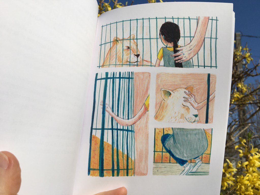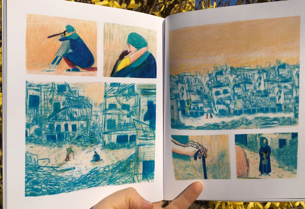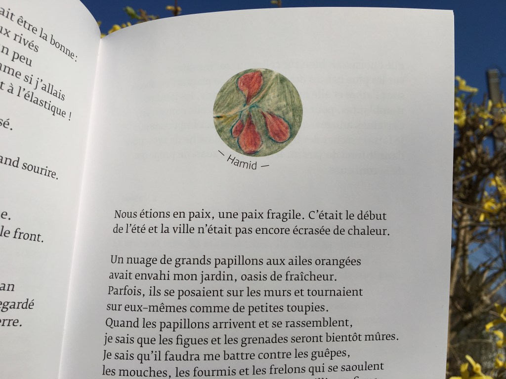L’insupportable flotte. L’indicible rôde. Au milieu du chaos, un peu d’espoir s’accroche. Plus fort que tout, il repousse la fatalité. Nourrir une lionne devient un acte de résistance contre l’inhumanité. Merci Nathalie et Yves-Marie Clément, d’avoir puisé l’inspiration dans le sauvetage des animaux du zoo d’Alep par l’ONG « Four Paws ». La réalité a précédé la fiction, et la fiction permettra peut-être de ne pas oublier. Pour accompagner le texte, Madeleine Pereira suggère le terrible quotidien par une lorgnette qui ouvre chaque prise de parole de Maya, Hamid et Labiwa. Il lui revient de nous offrir le scénario dessiné de la presque fin, où la poussière des gravats ne saurait être plus forte que le parfum des figues du jardin…