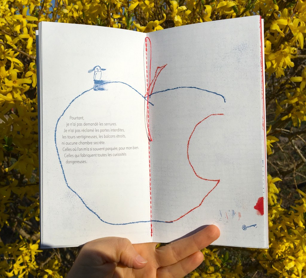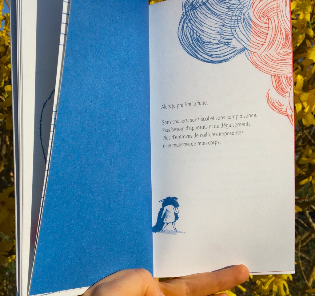 Aux filles du conte s’ouvre sur une peur bleue, alias une fillette crayonnée par Frédérique Bertrand, dont le contour déborde comme s’il peinait à se contenir dans un carcan devenu soudain trop étroit. Les corps se réveillent, les écorces craquent, la mue démarre, la métamorphose s’affirme. Le rouge arrive. Il repousse les petits pois dissimulés sous les matelas. Il offre la passion de vivre dont il faut saisir le mouvement, l’effondrement, la tempête peut-être, l’envol sûrement !