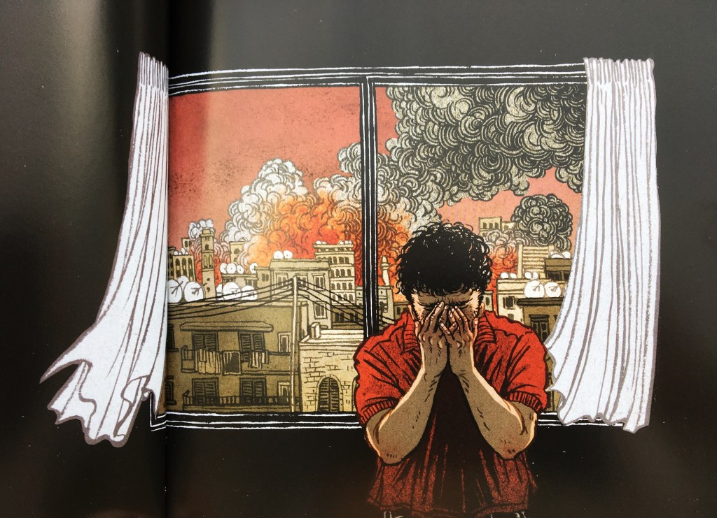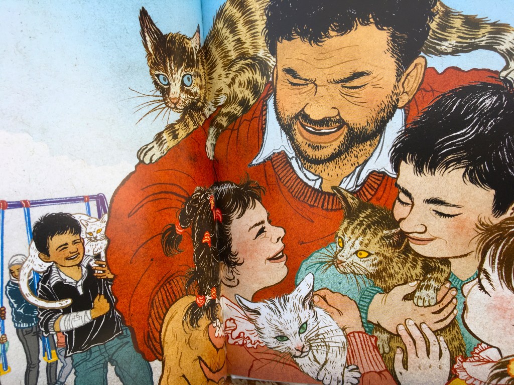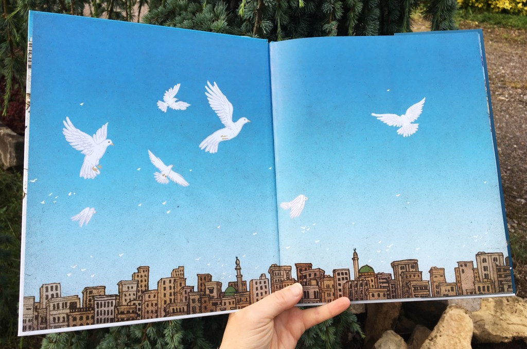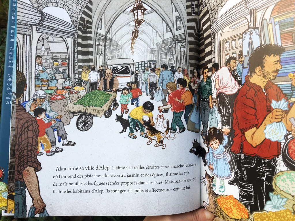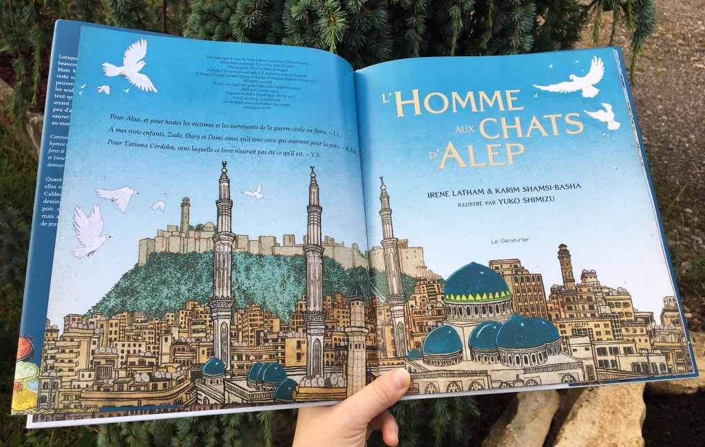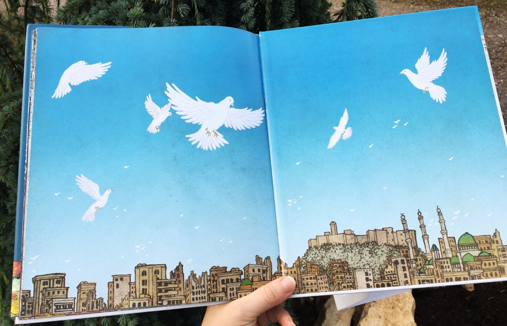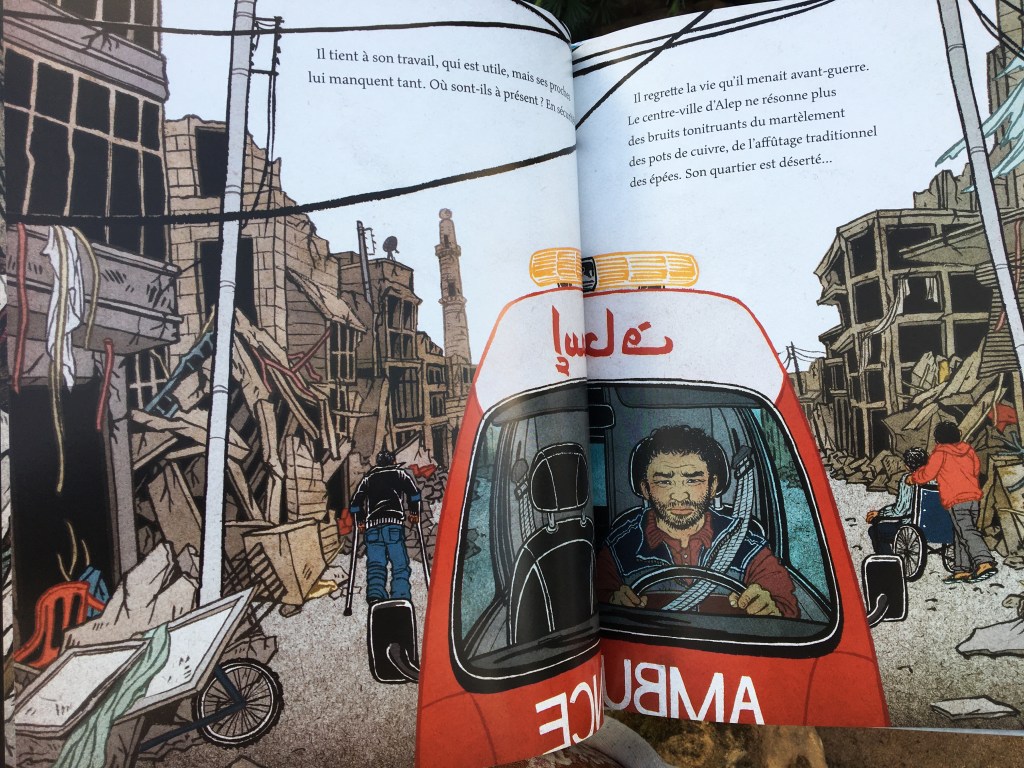 L’histoire est vraie. Je suis tout émue de l’avoir découverte, sûrement de cette même émotion qui a conduit Irene Latham et Karim Shamsi-Basha à l’écrire pour la mettre à hauteur d’enfant. Yuko Shimizu nous en offre les illustrations où le réalisme nous épargne mais suggère tout de même, par le biais d’une carcasse d’auto, de pansements et béquilles d’enfants, la violence de la guerre.