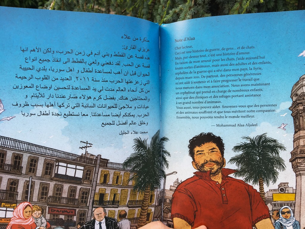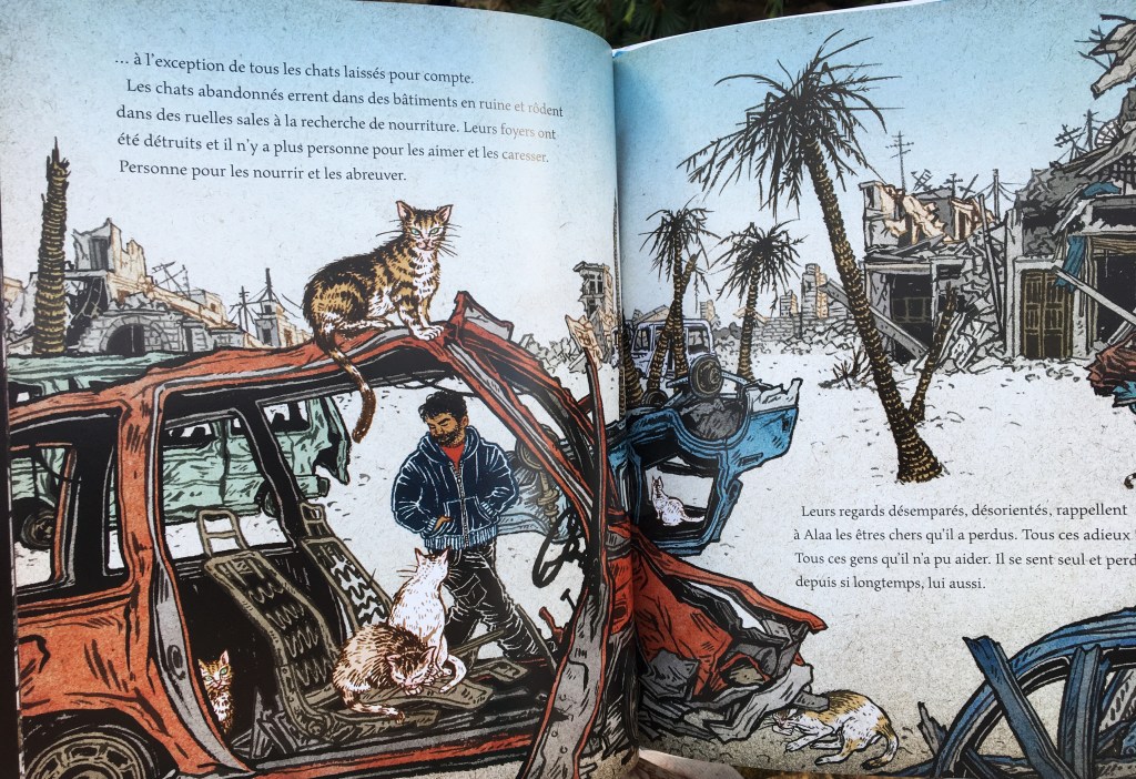 Alaa est resté, pour aider. Toute la journée il fait l’ambulancier, tâchant de secourir les trop nombreux blessés. C’est cela qui le fait tenir : le sentiment d’avoir une utilité dans ce monde en ruine. Dans les quartiers détruits, il n’y a plus âme humaine qui vive. Mais il y a les chats, tous les chats abandonnés par leurs maîtres dans leur fuite pour survivre.