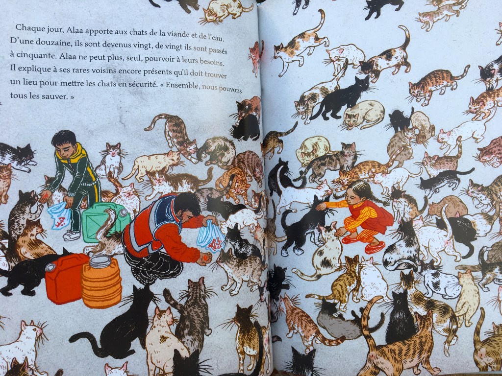 Survivre. C’est bien ce que les chats essayent aussi de faire. Un jour il y a le miaulement de trop, celui qui fait fondre de douleur et de compassion le cœur d’Alaa. Puisque c’est ainsi, il fera tout pour eux aussi. Détourner le regard : c’est fini. Quand sa journée de travail s’achève, Alaa achète de la nourriture et s’en va nourrir et abreuver tous les félins oubliés. Les chats se passeraient-ils le mot ? Chaque jour ils sont plus nombreux à venir quémander.