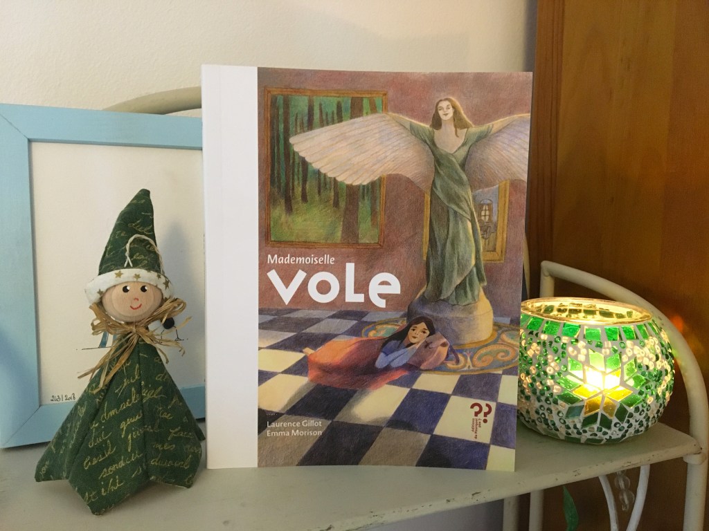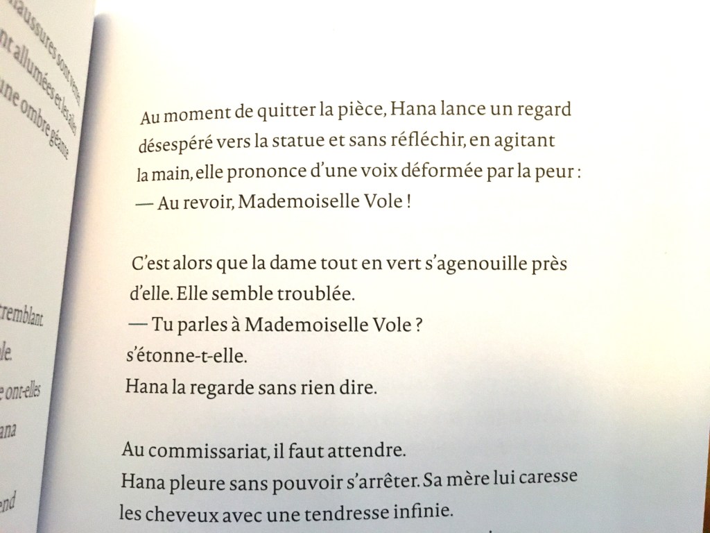Heureusement, l’histoire nous épargne les nuits à la belle étoile. Chaque soir le même rituel se répète pour assurer une nuit « au chaud ». Comment ont-elles eu l’idée, la mère et la fille, de s’introduire dans ce musée ? Depuis combien de temps font-elles cela ? Mystère… mais au moins ici Hana se réchauffe, et surtout elle se réconforte auprès de Mademoiselle Vole. La gigantesque statue de femme ailée rassure l’enfant et accueille ses confidences. De ses ailes elle abolit les frontières, elle ramène les saveurs des biscuits du pays, le souvenir doux-douloureux d’une vie qui fut heureuse… Fin du demi-rêve quand Hana se réveille un matin avec des bottes de policier devant les yeux.