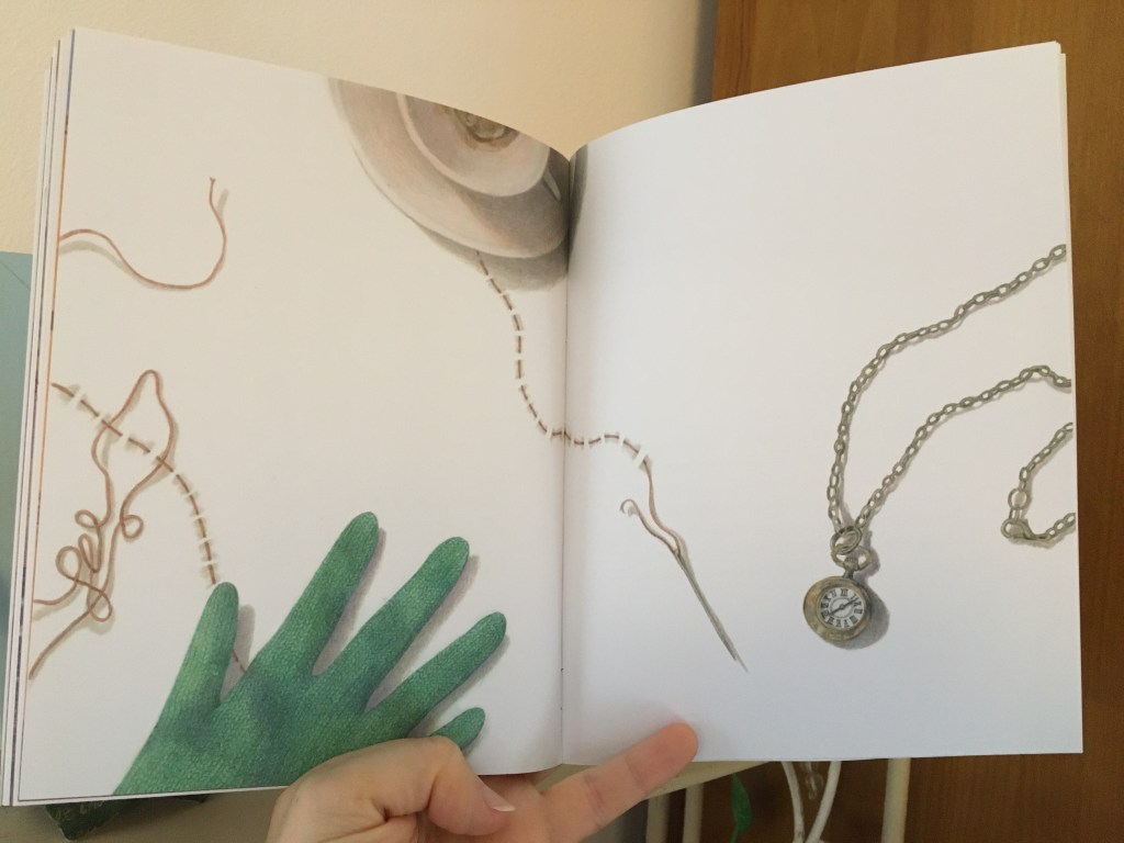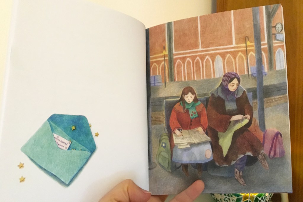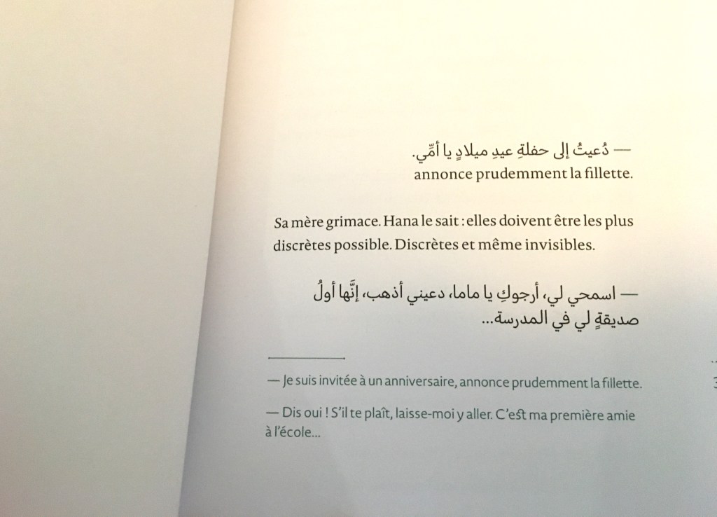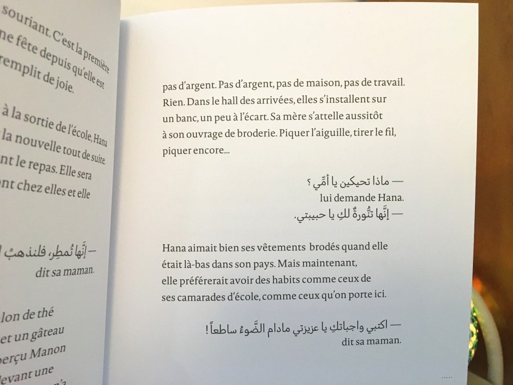 Le récit est pudique, poignant. Des phrases en écriture arabe renforcent la portée du texte : pour une fois ce sont les lecteurs francophones qui vont être un peu mis à distance, cette distance au parfum de barrière linguistique que se prennent de plein fouet tous les migrants. Les vies d’Hana et de sa maman ne tiennent qu’à un fil, ce fil qu’Emma Morison fait apparaître ponctuellement, avec ses nœuds, son aiguille, lien ténu avec la vie de là-bas, la vie d’avant et celle de maintenant…