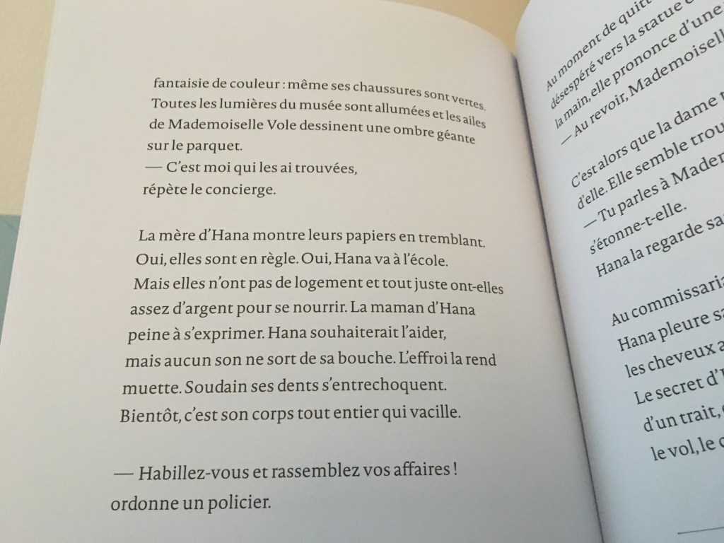 Hana et sa maman ont le droit d’être en France : les papiers officiels sont en règle. Mais entrer en douce dans un musée pour y dormir, ça c’est interdit. Est-ce que ça y est : le rêve occidental est-il brisé ? On pourrait le croire, jusqu’à l’hésitation qui perce dans l’attitude de Gabrielle, une dame en vert alias la directrice du musée… Et si la grande Mademoiselle Vole avait décidé de venir à l’aide de sa jeune amie ?