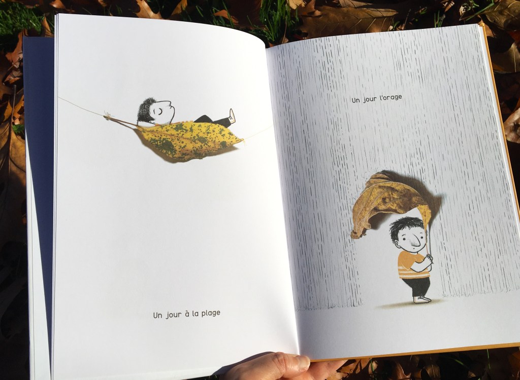 Dans mon jardin, depuis quelques jours, le roux recouvre le sol. Les feuilles jouent dans la brise, chantent un doux bruissement, s’étalent sur le sol telle un plaid chaleureux… C’est donc le moment idéal pour ouvrir Un jour comme ça. Sur la couverture, un petit personnage semble imiter les feuilles. Quelles surprises nous réserve-t-il ?
