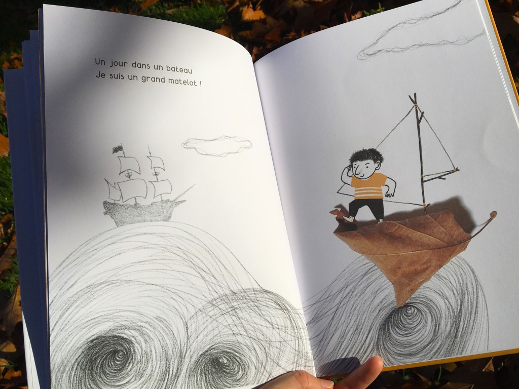 J’aime énormément la créativité exprimée avec ces feuilles d’automne. L’automne, la saison de transition par excellence. Dans ces pages le rouge côtoie la fin du vert, l’ambré et l’orangé. Les feuilles se déplient, deviennent bateau, monture galopante, parachute ou parapluie ! Les rimes se succèdent, insufflant un rythme léger et joueur à cette lecture. Texte et illustrations se répondent parfaitement, comme une évidence.