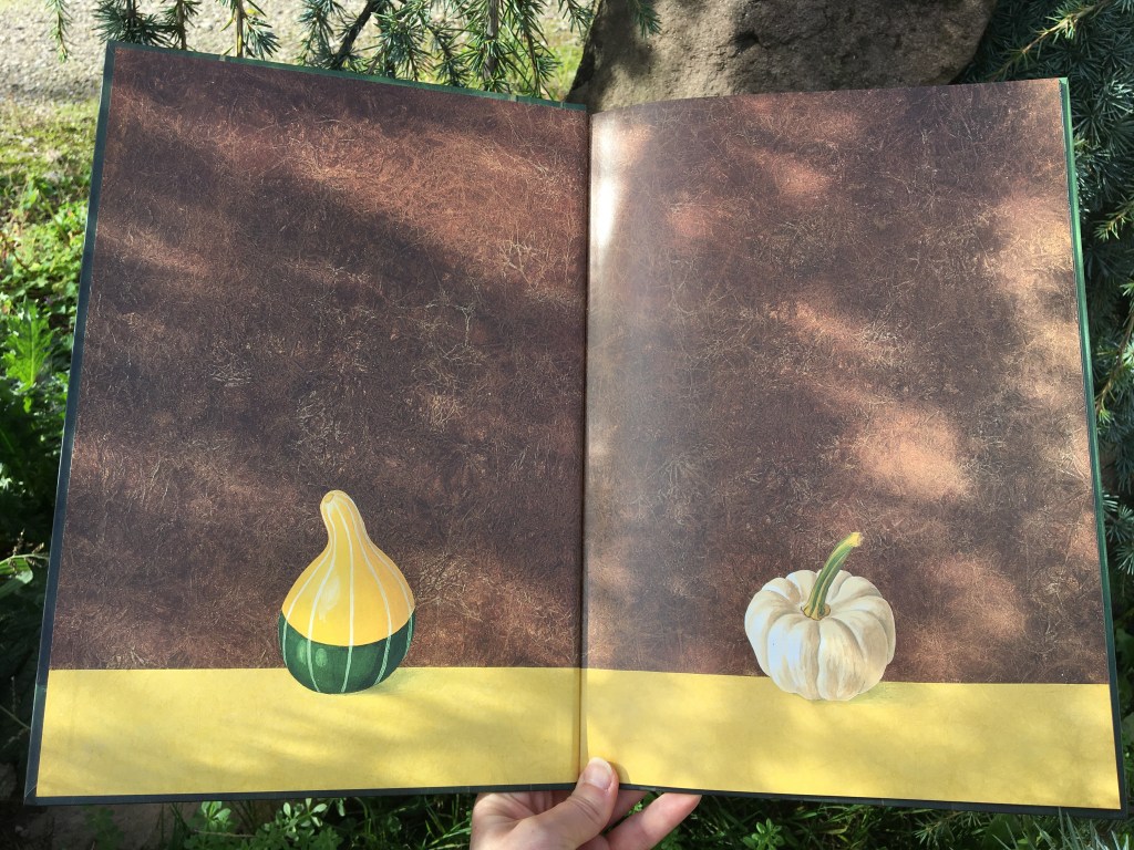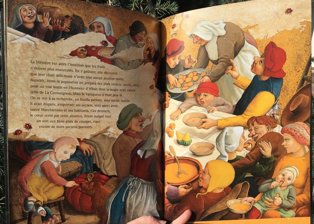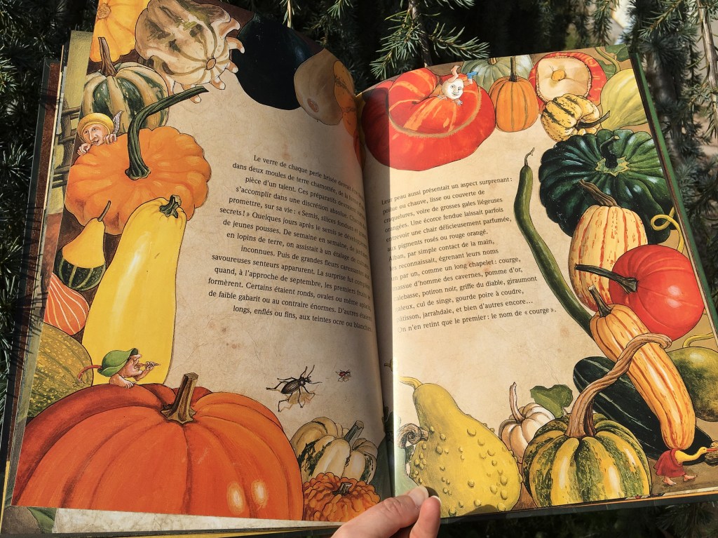 Pour contrer la méchanceté, point de bonne fée mais des cucurbitacées ! Si cela peut paraître un tantinet insolite, j’y perçois un rappel (au cas où nous l’aurions oublié) : la vraie magie naît de la terre… Il convient de considérer avec admiration la diversité de formes, couleurs et saveurs de ce qu’elle nous offre. Heureusement pour nous, les courges se désensorcelèrent à la fin du conte, pour le grand bonheur des papilles de tous le village (et les nôtres, si l’on considère qu’il y a là une légende racontant leur apparition).