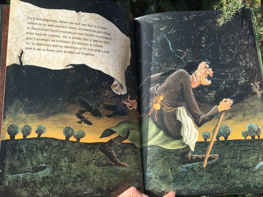Ce conte à l’ambiance rudement automnale nous transporte à une époque moyenâgeuse. Dans cette contrée de Marchiennes, une sorcière fort cruelle est restée après avoir eu un pied broyé par un piège à loups. Depuis, elle terrorise le village. Installée dans un marais, la Cormoignon ramasse, cueille, rassemble de quoi concocter des potions maudites. Si les habitants ne se plient pas à ses exigences, elle se venge impitoyablement, bouleversant les éléments ou d’un regard, en transformant les gens en corbeaux. Pour comble d’infortune, la mégère est dotée de l’immortalité. Ce calvaire ne trouvera donc jamais de fin ?