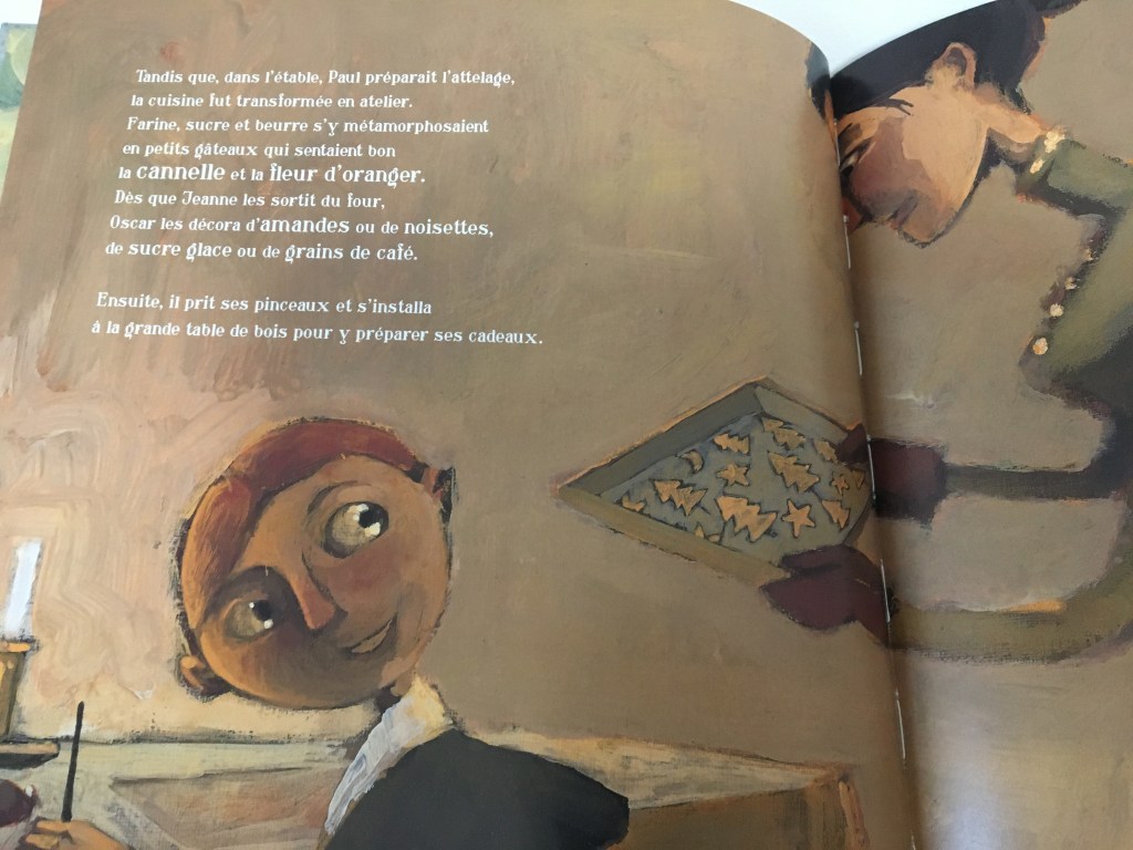Oscar se réjouit : avec ses parents ils vont aller passer Noël à la ferme de bon-papa Siméon. En attendant le moment de partir, l’enfant et sa maman s’activent en cuisine. Bientôt, les doux effluves des biscuits tout juste sortis du four viennent leur taquiner les narines. Pendant que son père attelle la charrette, Oscar patiente avec ses pinceaux.