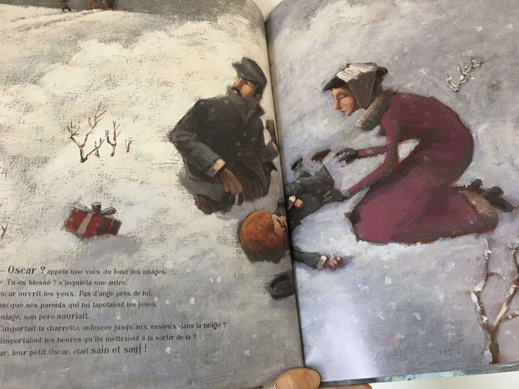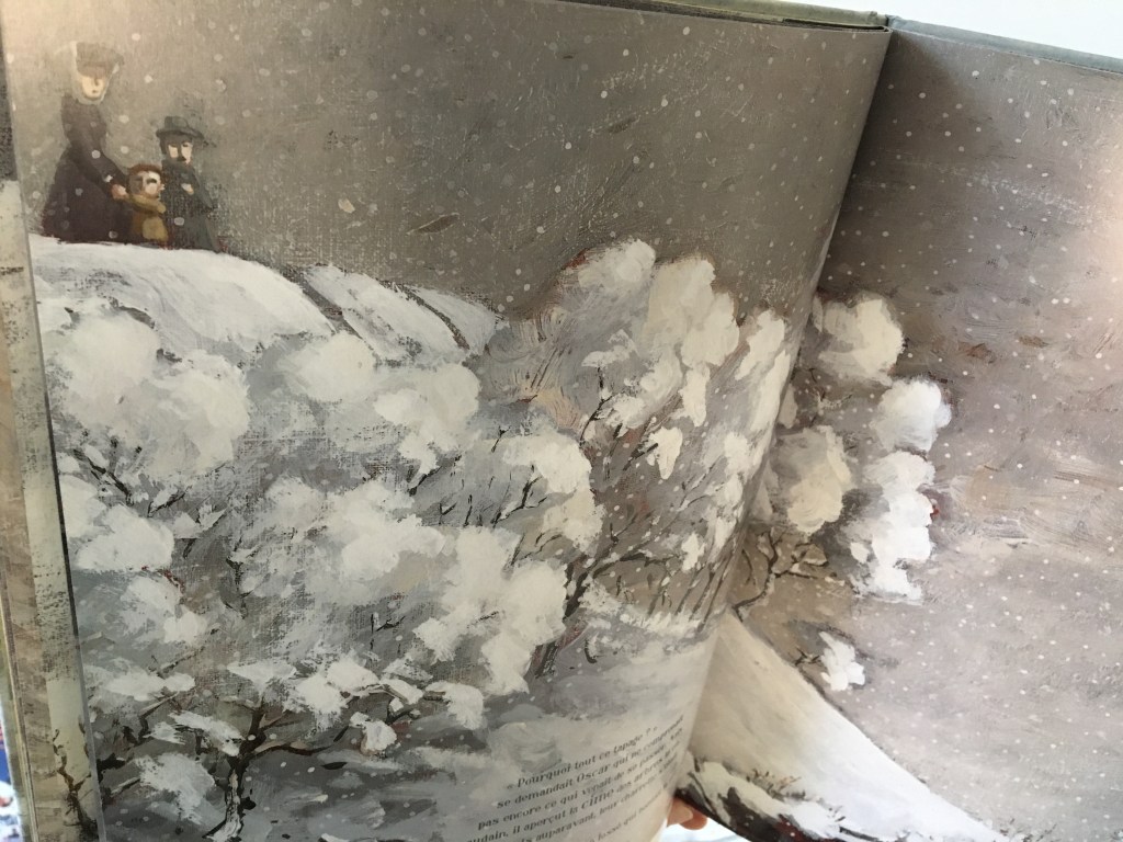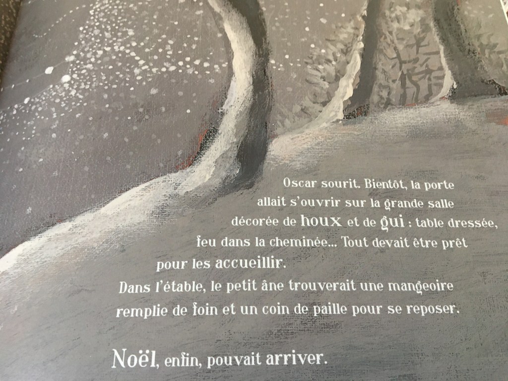Merci Géraldine, pour ce conte de Noël où les ingrédients hiver-enfance-Noël-mésaventure-impressionnisme sont si habilement mélangés que je savoure chaque année cette histoire comme un délicieux biscuit doré. Merci Stéphane Girel de si bien marcher sur les pas du maître, et pour rendre magnifique cette ambiance grise avec toute cette neige tourbillonnante, et pour les cadeaux qu’on devine dans le crépuscule du ciel. La vie peut basculer à tout instant. Rien n’est acquis. Alors merci pour ces arbres de Noël, héros modestes qui par hasard auront sauvés une (sainte) famille et un petit âne. Merci enfin pour ce Noël du XIXe siècle, intimiste et familial, émouvant et porteur d’espoir !