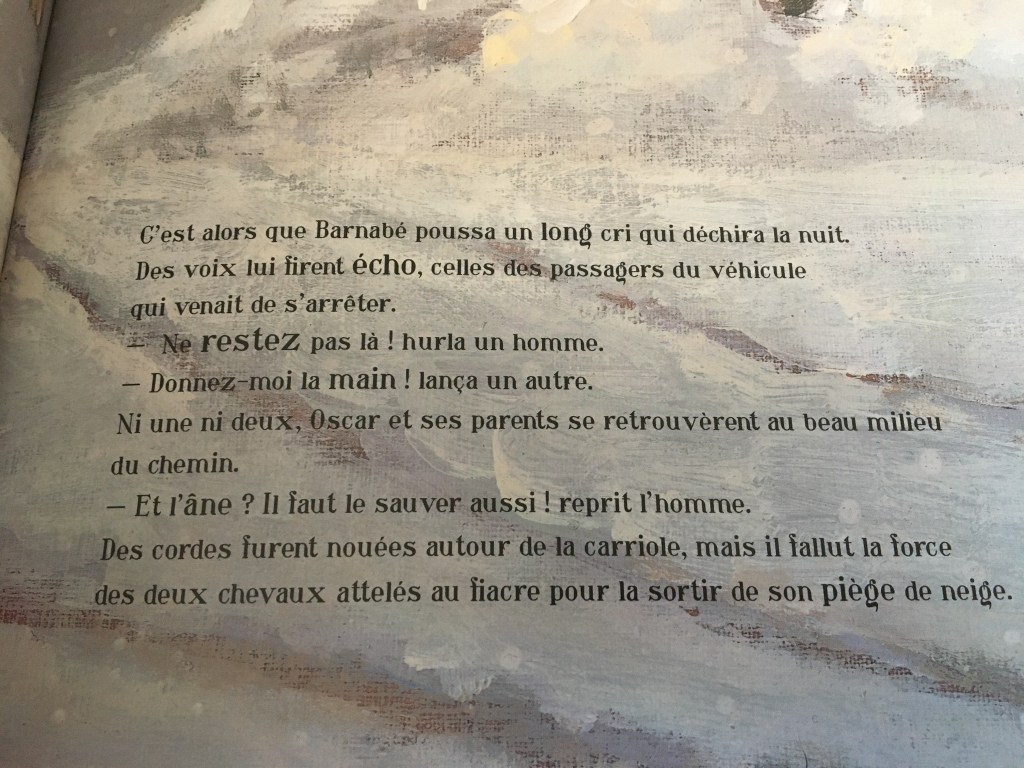Dehors l’hiver est bien là, avec son ciel gris et ses flocons tourbillonnant doucement. Bien emmitouflée, la petite famille se met en route au rythme de la clochette qui tinte au cou de l’âne Barnabé. L’enfant s’assoupit. Quand il se réveille, la neige tombe en tempête et ses parents sont inquiets. Ils ne reconnaissent pas le chemin… Quand un fiacre débarque brusquement sur le chemin, le petit âne n’a que le temps de faire un écart pour éviter la collision. L’enfant est éjecté dans les airs…
