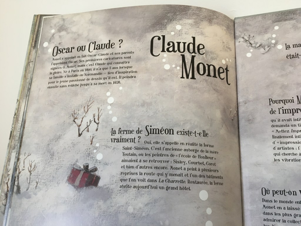 Il va de soi que j’aime aussi Les arbres de Noël pour le trait d’union qu’il établit entre le célébrissime peintre et notre époque. S’il est davantage connu sous la signature « Claude Monet », le père de l’impressionnisme a aussi été enfant. Amoureux de la Normandie, amoureux de la nature, s’attachant à la représenter non-figée, dans ces pages on rencontre l’humain avant l’artiste.