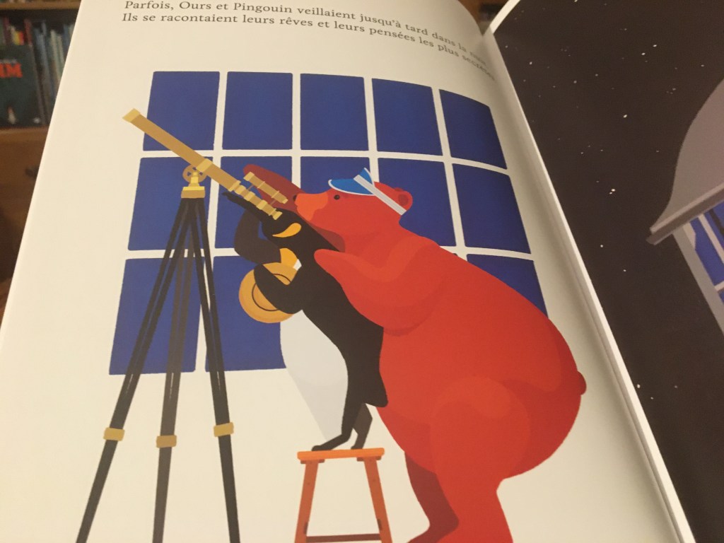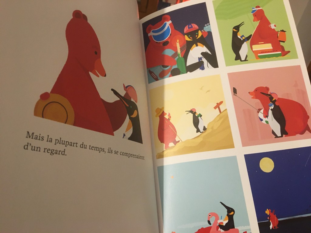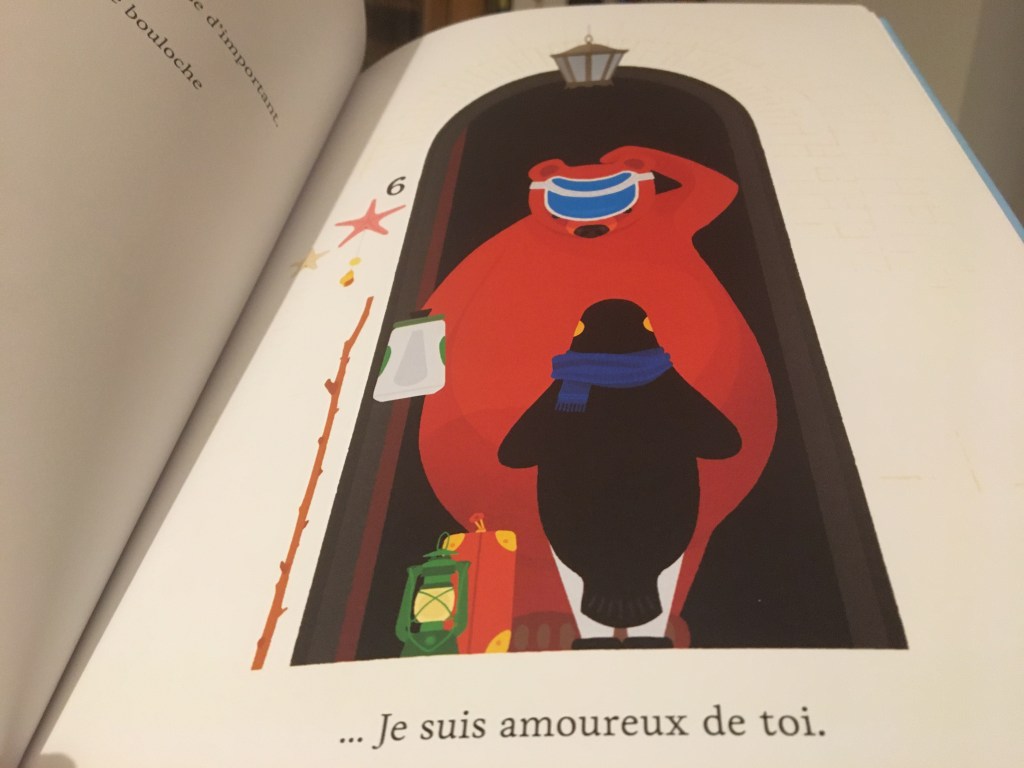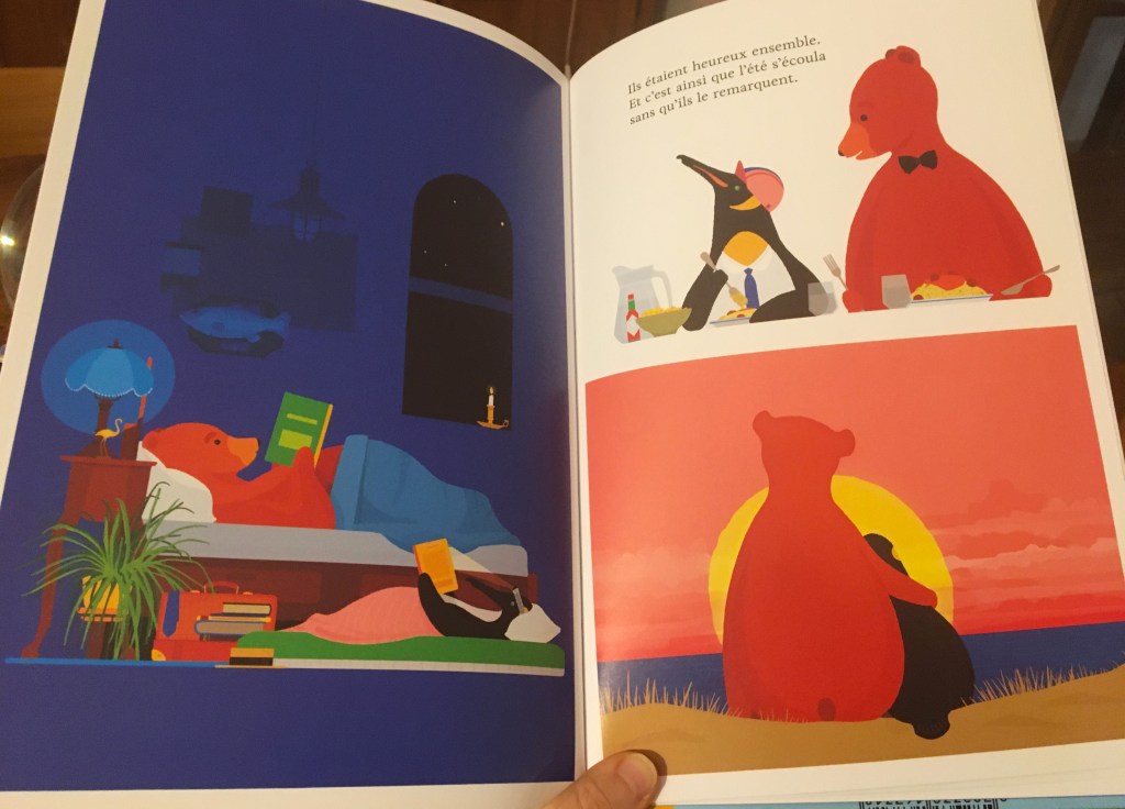 Ours se retrouve seul et triste. Un peu de temps lui est bénéfique pour comprendre, analyser et admettre qu’il ressent une chose très forte pour Pingouin. Mais pour lui, ça ne passe pas par le « « tangage intérieur » ou autres « chatouillis ». Moralité : en amour, chacun doit apprendre à reconnaître ses propres signaux.