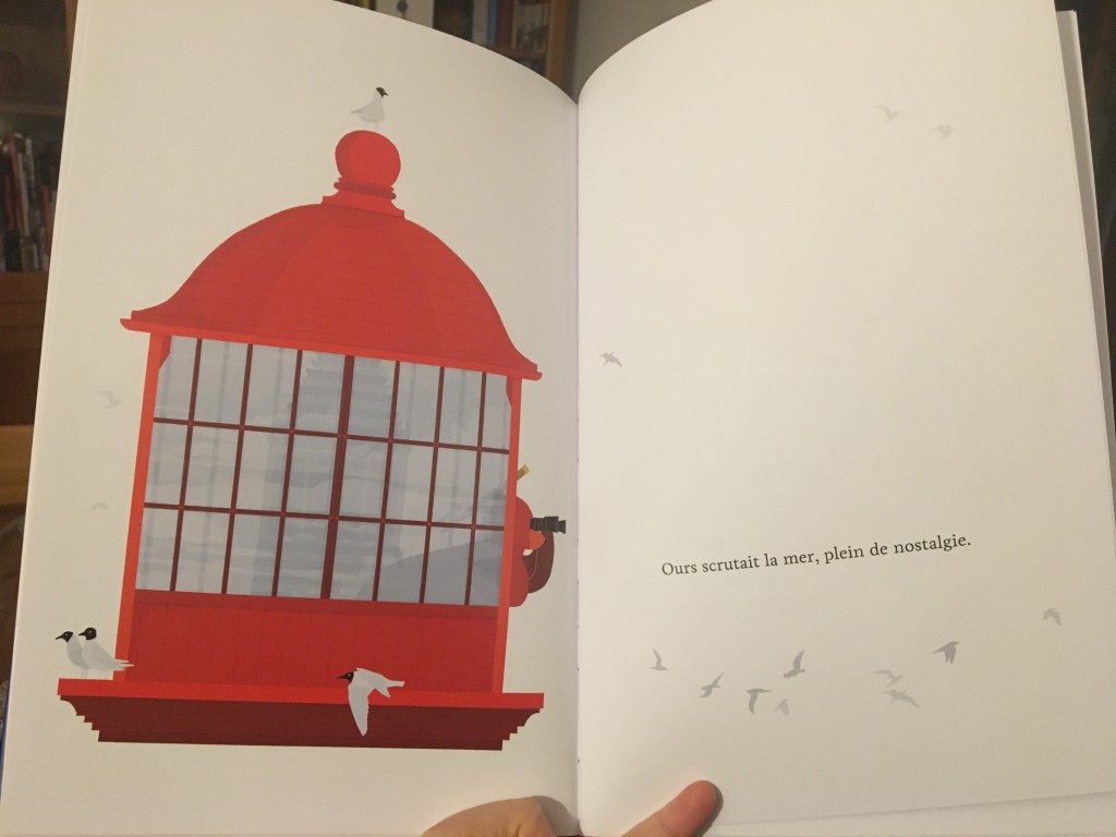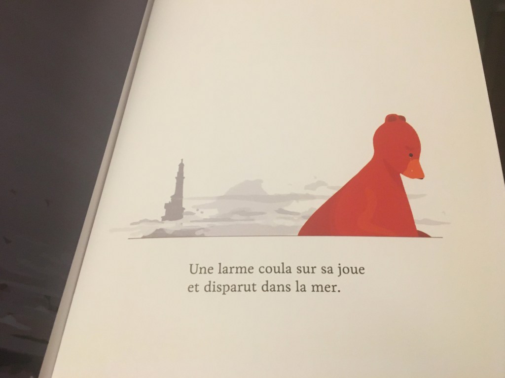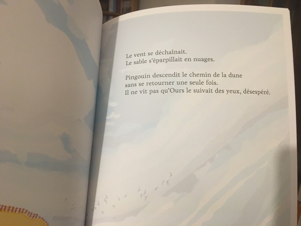 Il y avait tout ce qui les sépare. Maintenant il y a tout ce qui les rassemble. En théorie. En pratique, on le sait bien, ce n’est pas simple avec l’amour. Pingouin a toujours des chatouillis dans les orteils, sa tempête dans son ventre et le corps qui tangue. Aucun signe de cet ordre pour Ours. Alors Pingouin s’en va, trop triste pour envisager de se retourner. Il est décidé à rentrer chez lui, à mettre ni plus ni moins qu’un océan entre Ours et lui.