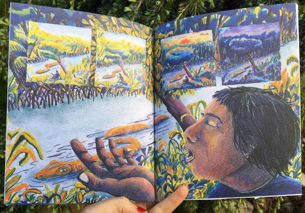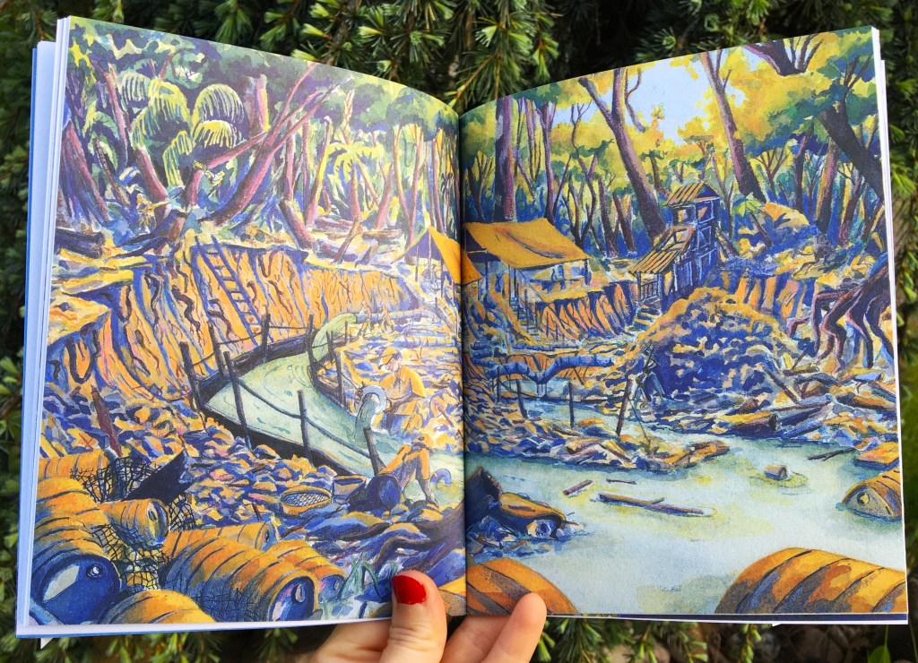 Entre fiction et réalité, Claire Clément nous embarque au cœur de la jungle amazonienne et dans le tumulte du fleuve où les piranhas sont à l’affut d’orteils appétissants. Les illustrations d’Alca ont le foisonnement et la densité des forêts primaires. Regardez comme les palétuviers incarnent le trait d’union entre l’immensité végétale et la rivière. C’est beau, dense, préservé semble-t-il. Mais si on zoome un peu, si on pénètre sous le couvercle du feuillage, une réalité terrifiante apparaît : la pollution des cupides chercheurs d’or empoissonne les cours d’eau et met en grand péril la santé des populations amérindiennes. Derrière l’admiration que la vie de ces dernières suscite, le danger est insidieux, grave, abominable… S’il est moins franc qu’une attaque d’anaconda, le mercure invisible contamine le poisson, principale ressource alimentaire des villageois. L’empoissonnement progressif des populations est une réalité.