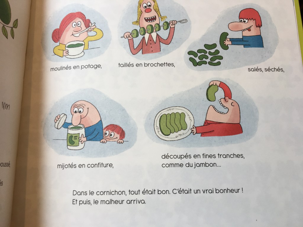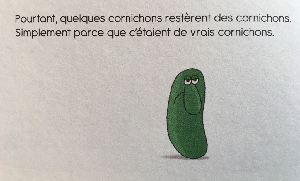 Moralité : il faut se méfier des cornichons qui n’auraient pas été solidement vinaigrés (ainsi que des vieilles femmes belliqueuses, et aussi des végétaux invasifs). Si le conte peut finir, pas le rire… Lui il a encore de longues heures devant lui, et les croûtons aussi !