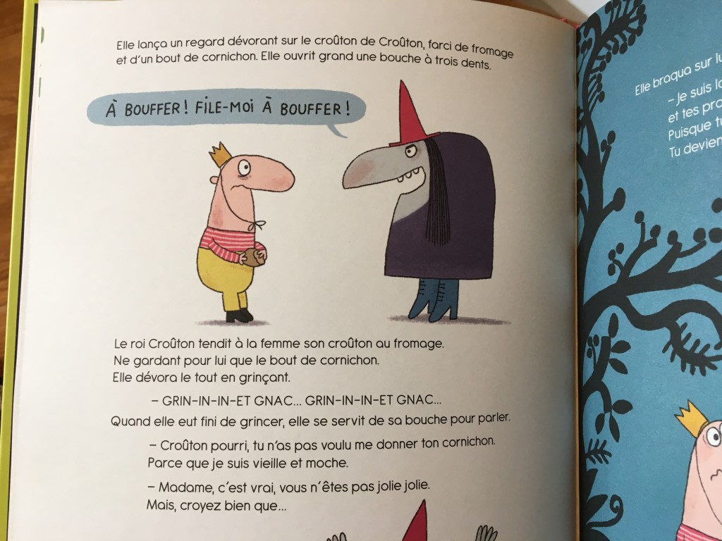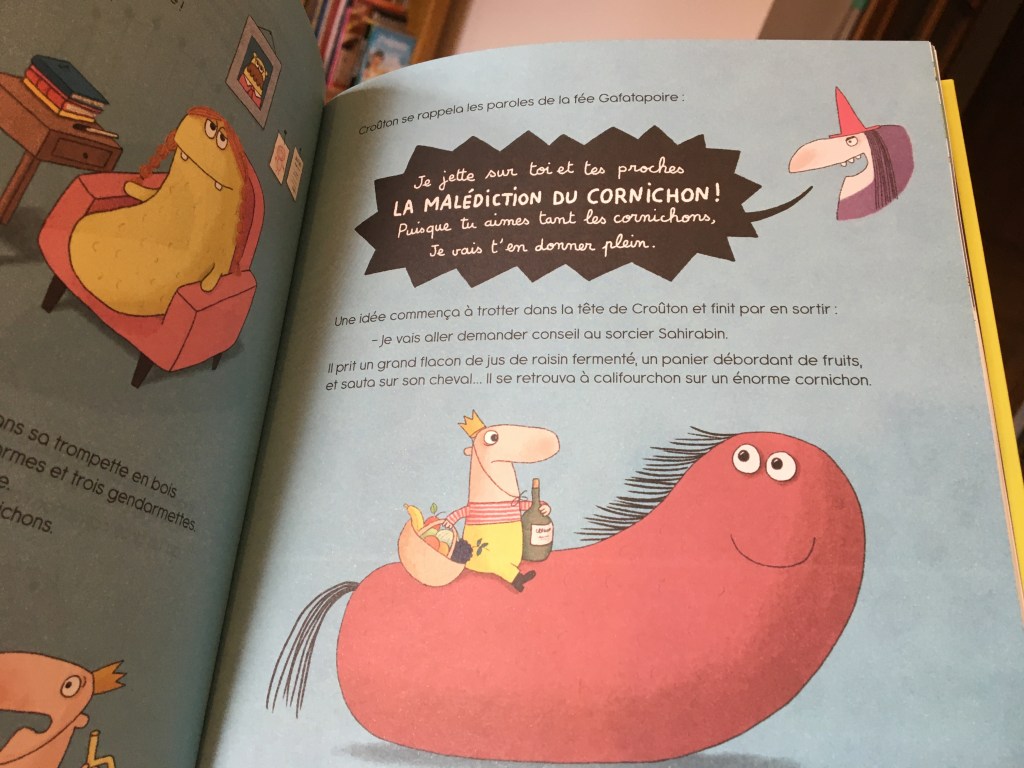 Une société de cornichons : vous aviez déjà vu cela ? Le sous-texte serait-il ironique, tragique, lucidement satirique ? Le pauvre Croûton se retrouve vite cerné par une épouse cornichon, une première ministre cornichon, et même un cheval cornichon ! Vite, il n’y a plus qu’à aller trouver le sorcier Sahirabin (et espérer qu’il trouve une solution à toute cette pagaille cornichonnière !). Car un royaume de cornichons, faut bien l’avouer : ça craint !