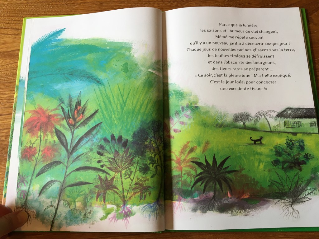 L’hommage aux plantes médicinales vibre de la force de cette île exceptionnelle. Au milieu de ce camaïeu verdoyant, foisonnant, Maiwenn Vuittenez nous fait faire un bond dans le temps, à l’époque où les tisaneurs et tisaneuses étaient à la fois les médecins et les pharmaciens, en d’autres termes, les garants de la connaissance des remèdes. Ici point de sorcellerie, mais une relation au végétal faite de respect, de reconnaissance et de patience. Il devient alors évident que la grand-mère initie la fillette à ses secrets en cultivant le mystère. Les sens sont émoustillés, la curiosité se dresse aux aguets avant que l’enfant puisse enfin goûter à l’étrange et magique breuvage…