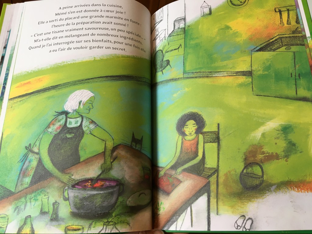 La grand-mère est une tisaneuse et aujourd’hui, pas question de laisser sa petite fille profiter du sommeil loin dans la matinée ! C’est justement le bon moment pour aller faire cueillette dans le jardin, faire connaissance avec les noms curieux des plantes. Attentive, studieuse, captivée, l’enfant écoute, sent, découvre, effleure du bout des doigts les écorces, feuilles, pétales…