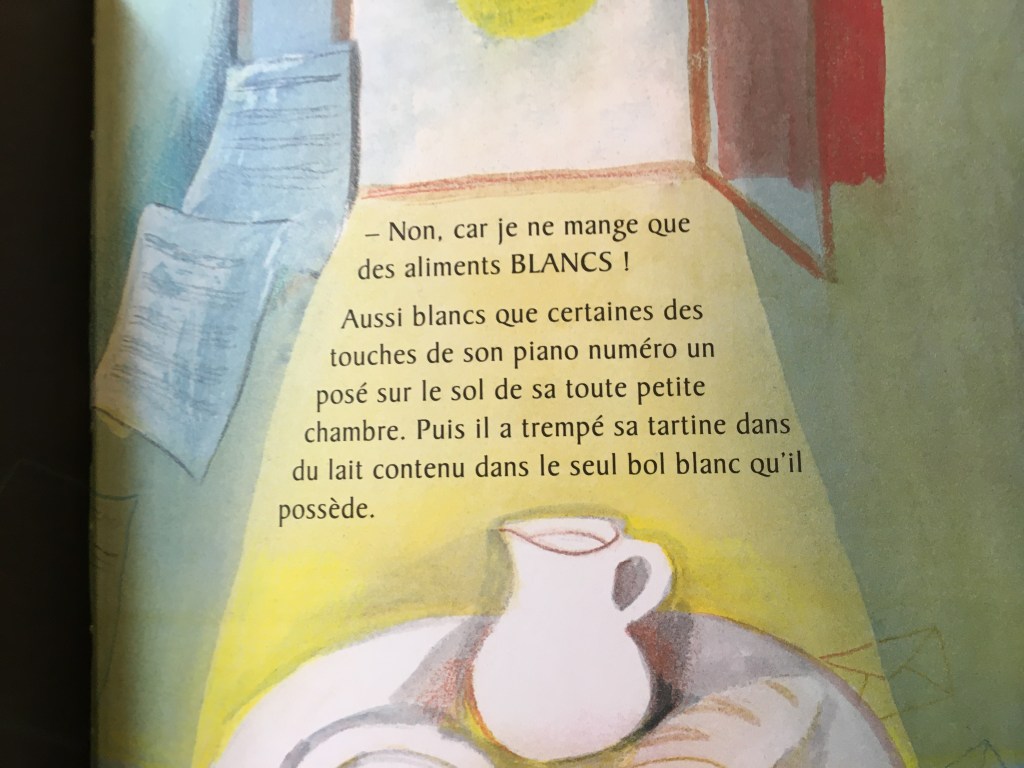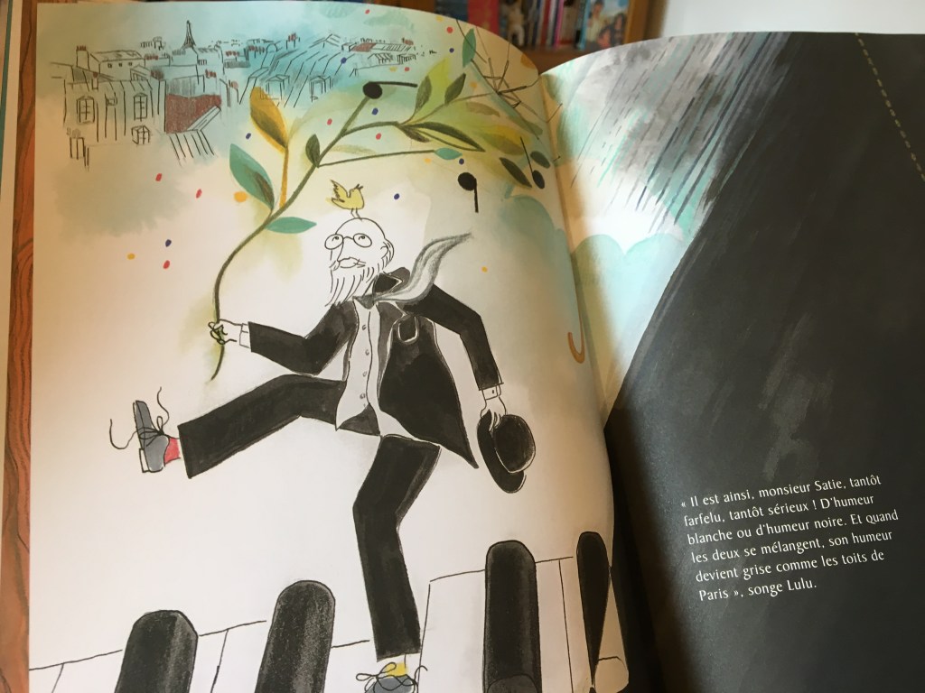 Comment résister au magnétisme de cet enfantin compositeur ? Entrons, le temps de quelques pages, chez ce singulier personnage… Claude Clément nous prend par la main et nous dépose dans un coin de l’appartement de Satie. C’est le petit matin, et le réveil sonne à « six heures, six minutes et six secondes précises. ». Le petit déjeuner sera blanc, car Satie ne mange « que des aliments BLANCS ». Rigide, le musicien calibre son quotidien mais sa musique, elle, s’envole et se joue des injonctions et autres codes.