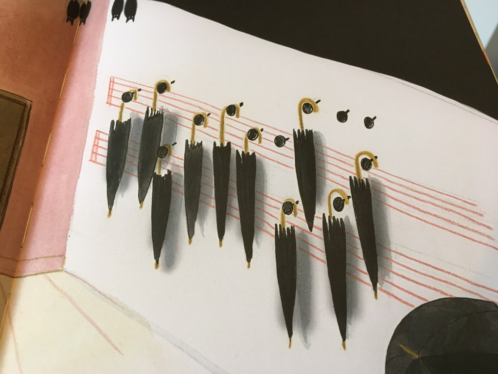 Clémence Monnet nous immerge dans un surréalisme esquissé, fondu, anguleux, malicieux… Je ne sais si je trouve ses illustrations davantage poétiques ou fantastiques de par le nombre de clins d’œil et autres références qu’elles y a semées, saupoudrées, dissimulées à l’ombre d’une coquille de moule ou par le trou d’une serrure… Quant au noir, il claque, enveloppe, se répand, menace puis cède en explosion de couleurs au triomphe du spectacle ! C’est juste magnifique…