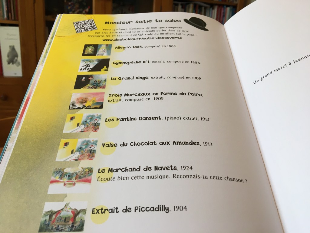 Chapeau bas, bravo et merci Claude Clément et Clémence Monnet pour cette étonnante rencontre avec Erik Satie ! Pour celles et ceux qui se promèneront dans ces pages, rendez-vous à l’écoute des morceaux cités dans l’album, si vous êtes curieux et gourmand.s (peut-être) de valse du chocolat aux amandes… par exemple !