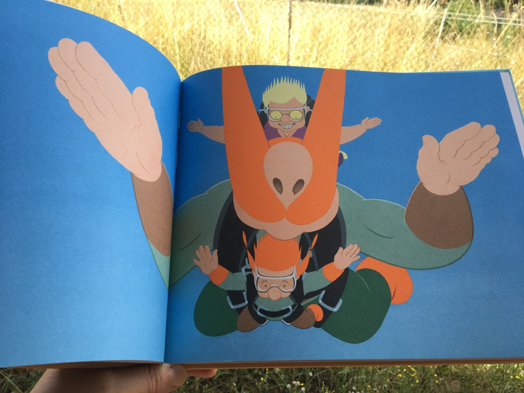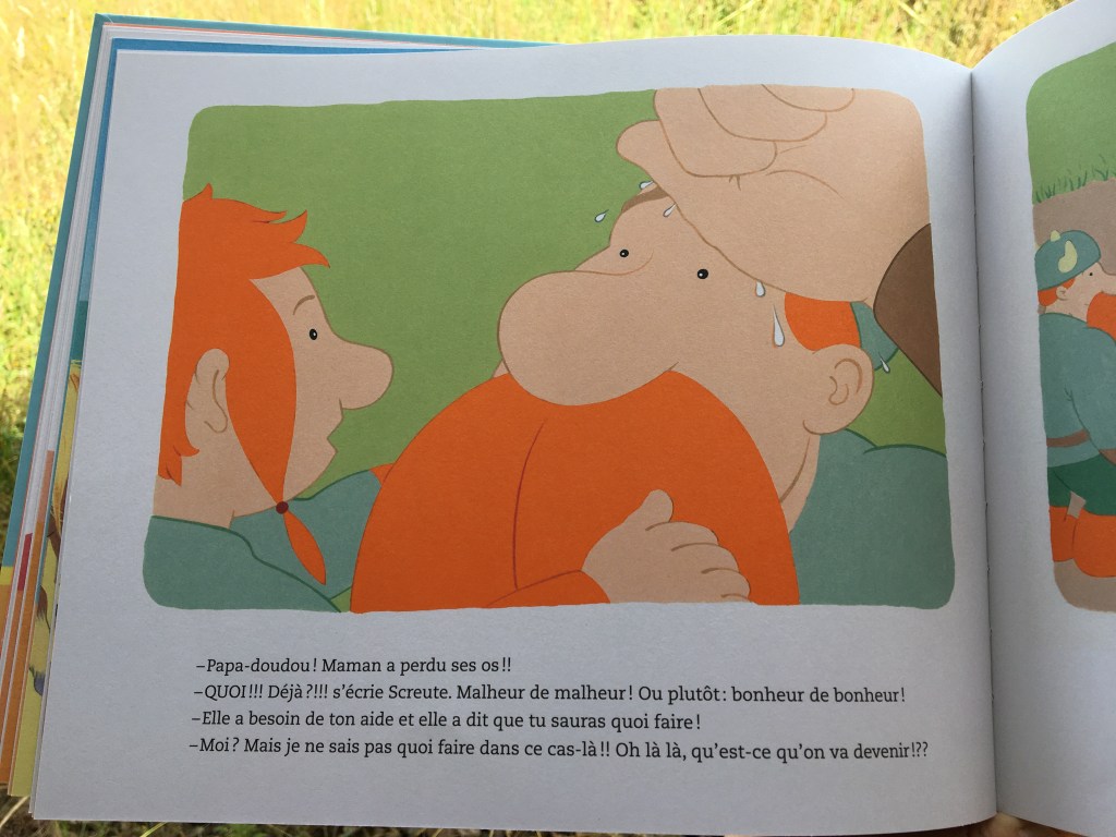 L’épilogue se dévoilera progressivement aux grands lecteurs, rendant tellement délicieuse la bobine dubitative du petit garçon face à toute cette agitation. Screute lui en perd son casque mais après un tour d’avion, tout est bien qui finit bien : des « os » aux « eaux », la subtilité phonétique fera de Scroute un grand frère…