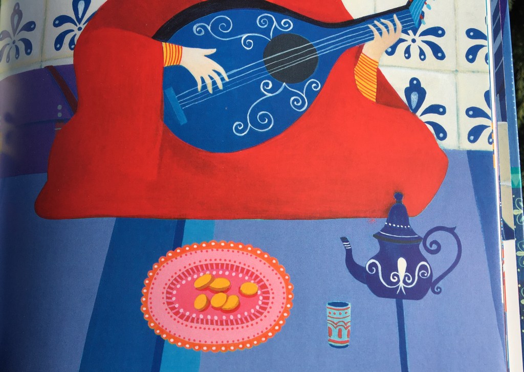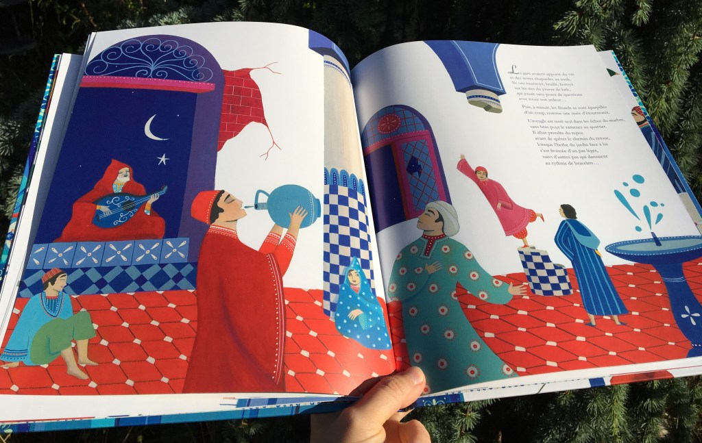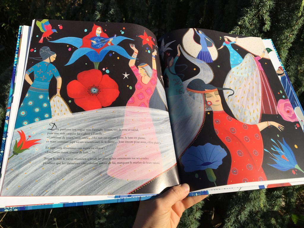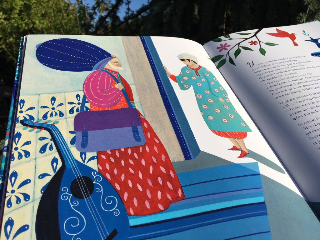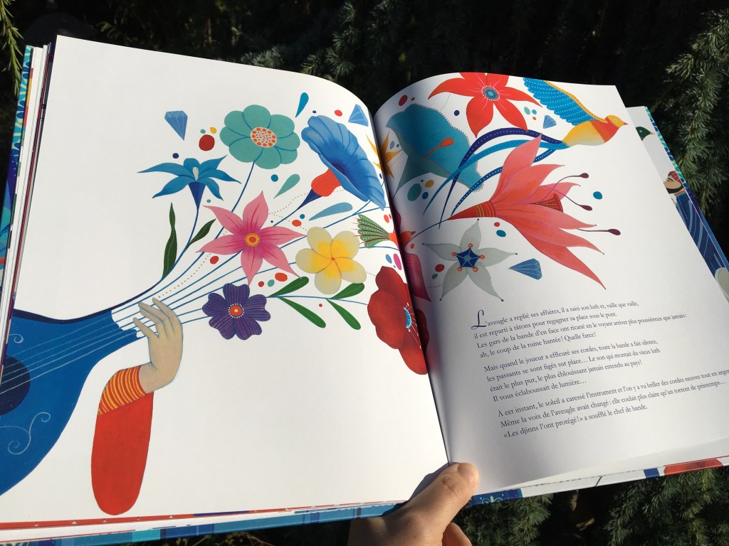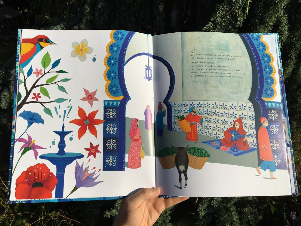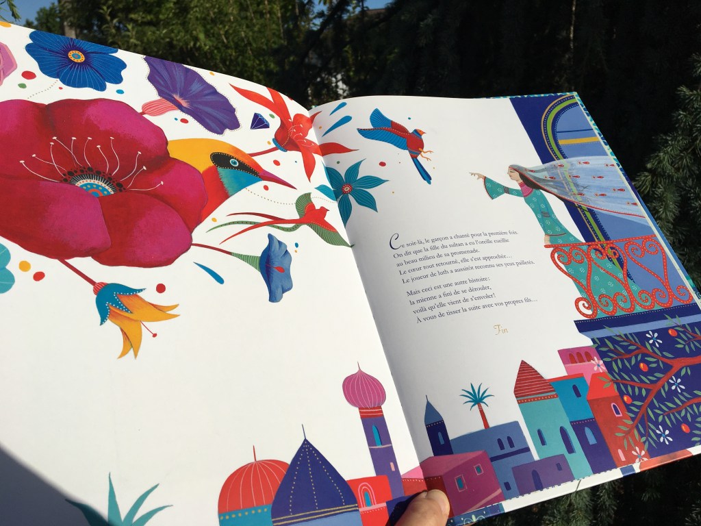 Avec cette ambiance qui fleure bon les Mille et une Nuits, les couleurs vives posées sur fond blanc sont un ravissement qui enivre les yeux égarés dans ces pages. Carole Hénaff nous offre des illustrations de rêve, où la musique devient un bouquet diapré. Pour un peu, les effluves de fleur d’oranger et d’amande émaneraient du conte. C’est un beau cadeau que Maria Diaz nous fait, de poser des mots aussi doux sur cette parabole. D’un mauvais tour peut découler une bonne chose. Lutter contre ce qu’on ne peut changer serait peine perdue : le musicien accueille l’infortune de la farce, et se retrouve miraculeusement récompensé. Le petit voleur corrige son destin, à force de travail et de patience cultivée. Le maître s’efface, l’élève prend son envol, le livre s’achève mais pas la douceur de son empreinte dans mon cœur de lectrice…