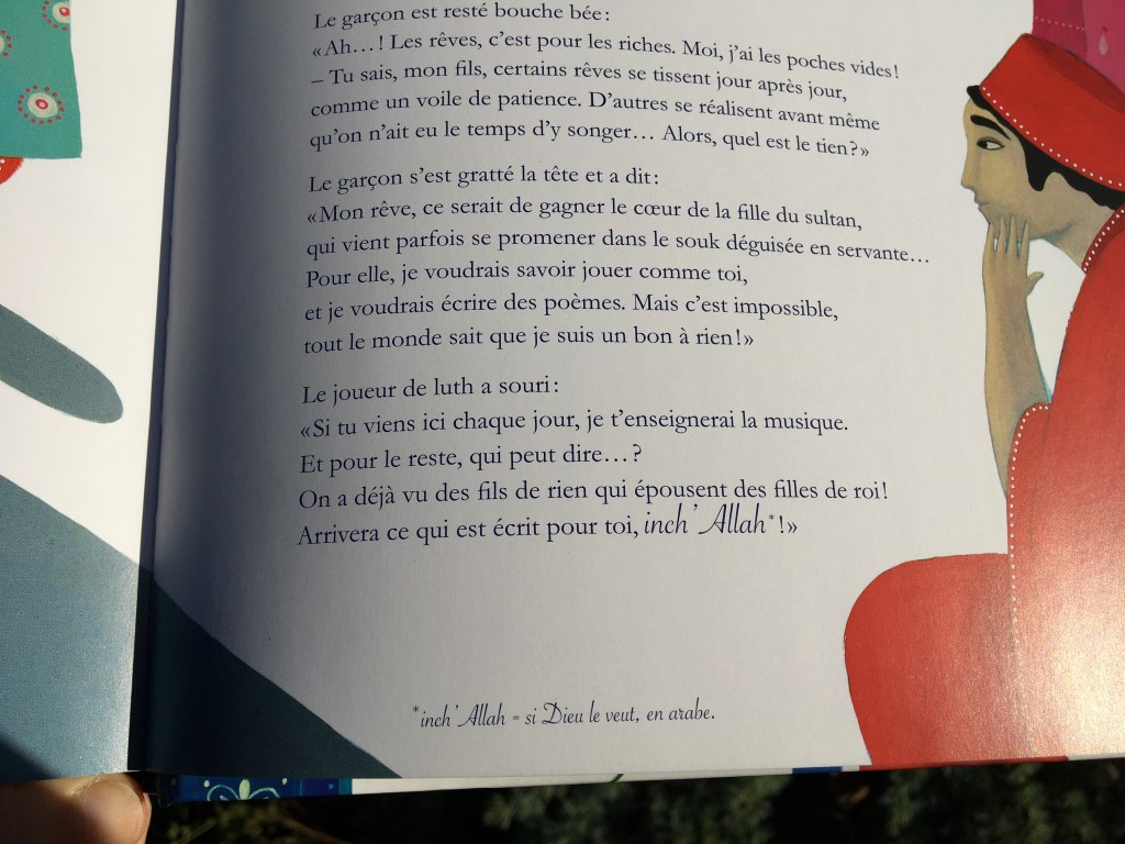 Le conte nous transporte dans une ambiance orientale propice à la poésie, au rêve, aux esprits malins qui récompensent les braves gens. Comme quoi, d’une mésaventure peut découler une bénédiction. La musique du luth n’est plus seulement belle, elle est magnifique, envoûtante et fait bientôt la renommée du vieil homme. De l’ombre du pont dans le souk aux riches salons du Sultan, il offre son art avec la générosité qui le caractérise.