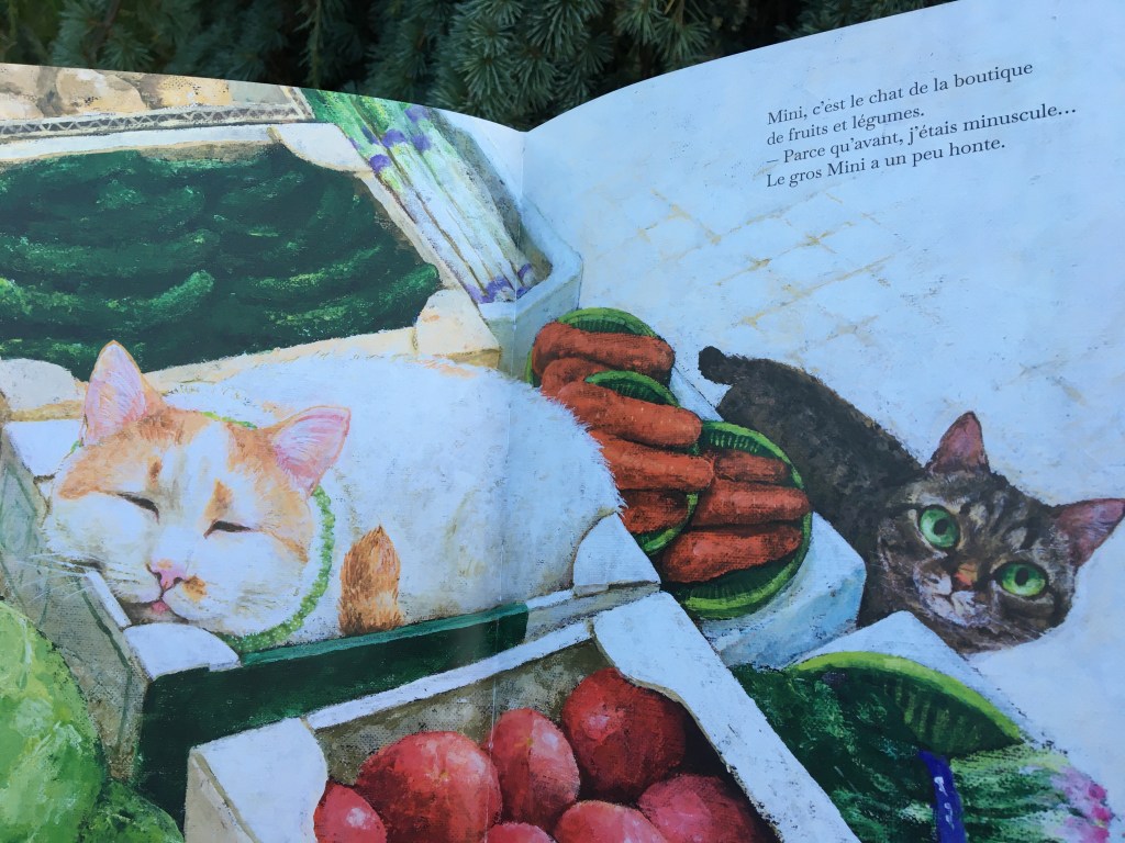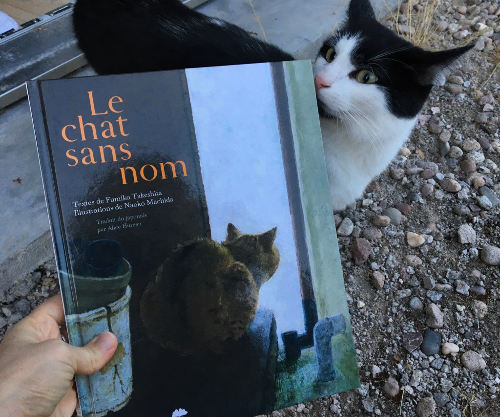 Dans une rue du Japon, un chat nous raconte qu’il n’a pas de nom. Personne n’a pris la peine de le nommer. Jamais. Hormis par le biais d’un déterminant et d’un substantif passant de « le chaton » à « le chat ». Pourtant dans cette rue commerçante, tous les chats ont un nom. Certains ont même des surnoms affectueux. Dans les commerces et même au temple, les félins pavanent, se prélassent, sont appelés par leur nom, caressés même. Ils regardent les humains dans les yeux, sauf s’ils sont occupés à roupiller. Le chat sans nom les observe, dubitatif. Lui dont le corps porte les stigmates de la vie dehors regarde ces chats bien nourris, empreints de confiance, identifiés : Grigri, Heidi et Clara, Bouton, Léo, Riku, Cracotte…
