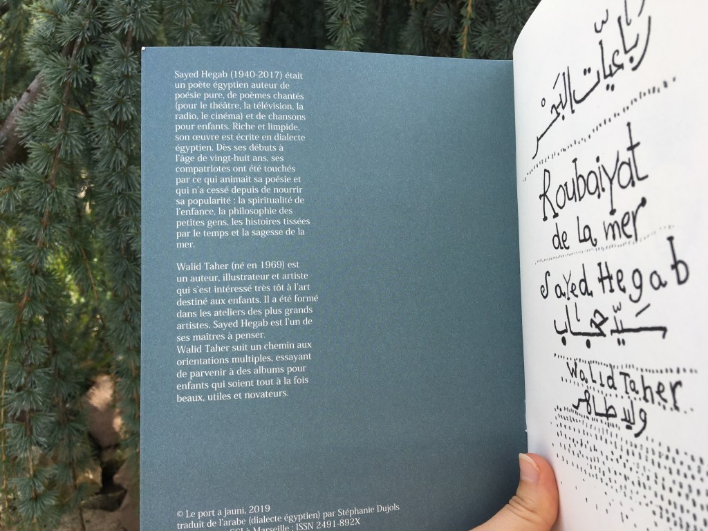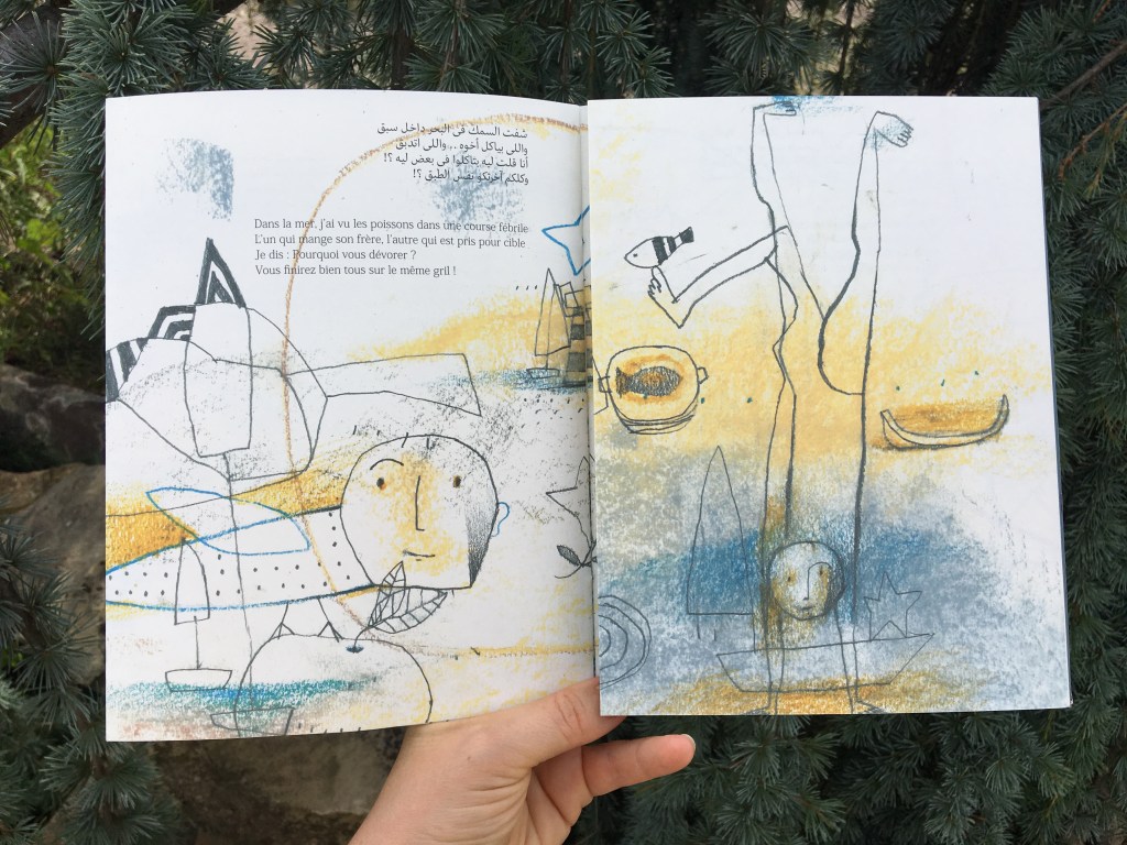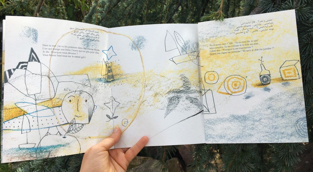 Le voyage se lit en français et en arabe, ainsi que Le port a jauni le transmet dans ses livres, ces ravissants petits traits d’union entre les cultures et les générations. Personnellement, j’adore. J’y plonge, je m’y retrouve, me délectant autant des mots que des illustrations.