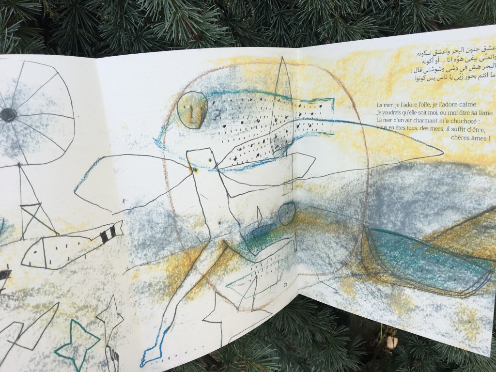 Comme pour répondre aux taquineries poétiques, l’ouvrage se déplie à deux reprises : double leporello pour quatre paysages aux allures de cadavre exquis. Qui regarde-t-on : la mer ou l’humain ? Walid Taher construit et déconstruit, croque, esquisse le corps, emmêle terre, ciel et eau, répondant à la perfection aux poèmes. La délicatesse de certaines lignes joue avec d’autres plus spontanées, imprécises, joueuses. Être enfant ou adulte ne compte plus : c’est à l’humain sans âge que s’adresse cet ouvrage !