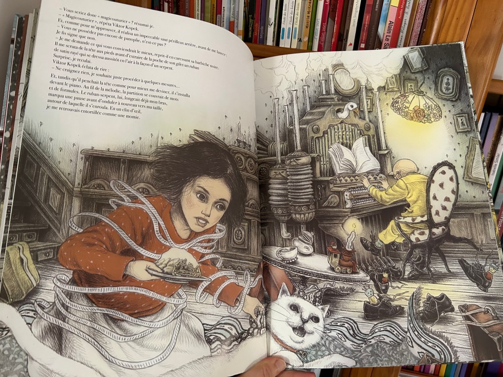 C’est l’album aux mille et un détails : l’œil croit suivre l’histoire mais bientôt il se perd, s’égare, dérouté par l’odeur de la cannelle sur la tarte aux pommes et par la danse du mètre ruban. Quand Viktor Kopek apparaît en face de l’enfant curieuse, la curiosité du lecteur est déjà plus qu’harponnée. Quelle est la mission de ce personnage fantasque aux allures d’Humpty Dumpty transformé en dandy ?