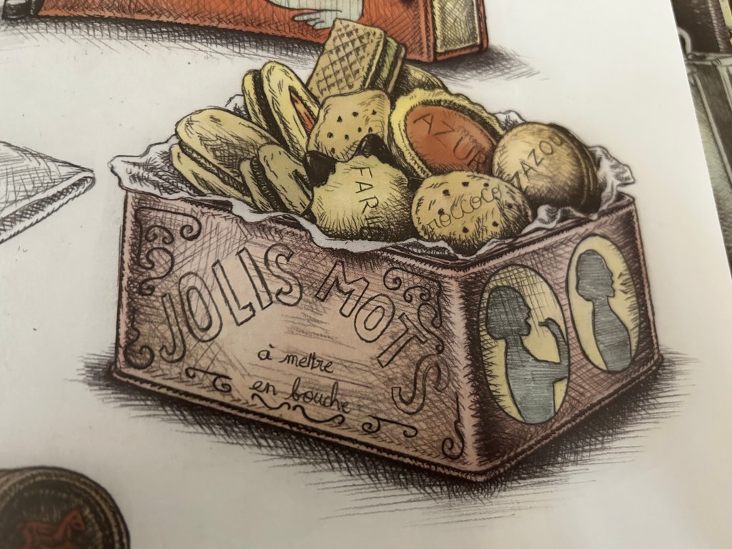 Les indices visuels répondent au chemin de devinettes déposé par d’Anne-Claire Lévêque. Nicolas Zouliamis nous offre un cabinet de curiosité où le singulier de la situation trouve écho dans les contes. Les rouages des babioles donnent envie de les actionner afin de vérifier s’ils sont à la hauteur de leur intrigante apparence. A moins que vous ne préfèreriez vous laisser tenter par un biscuit « jolis mots » ?