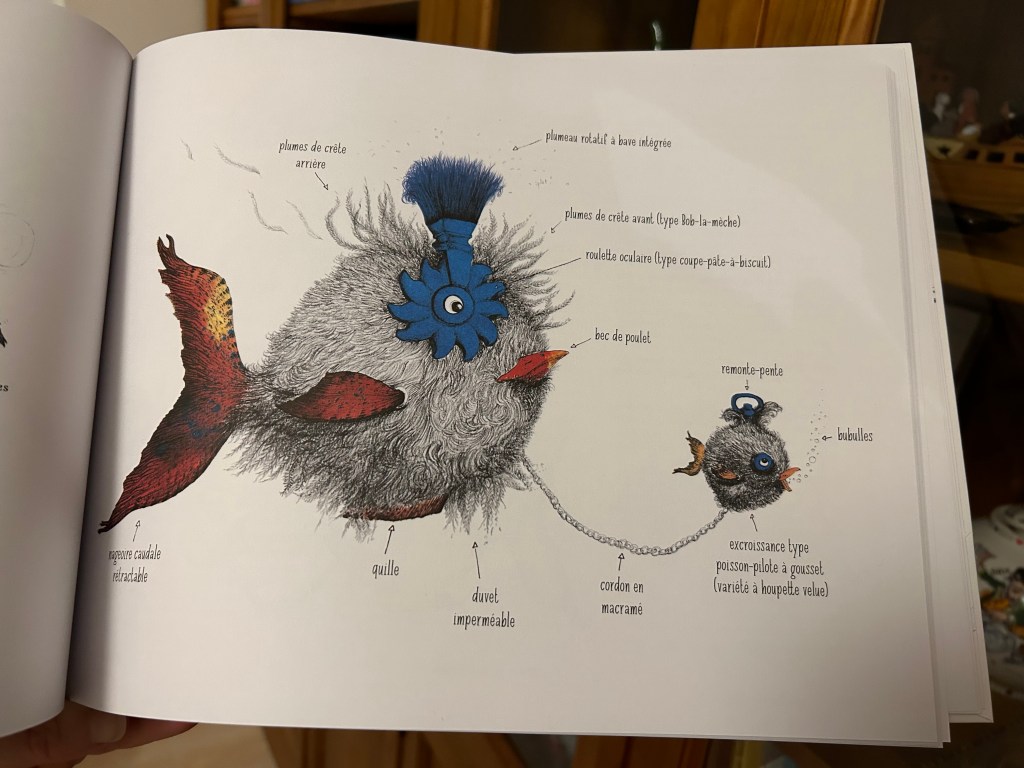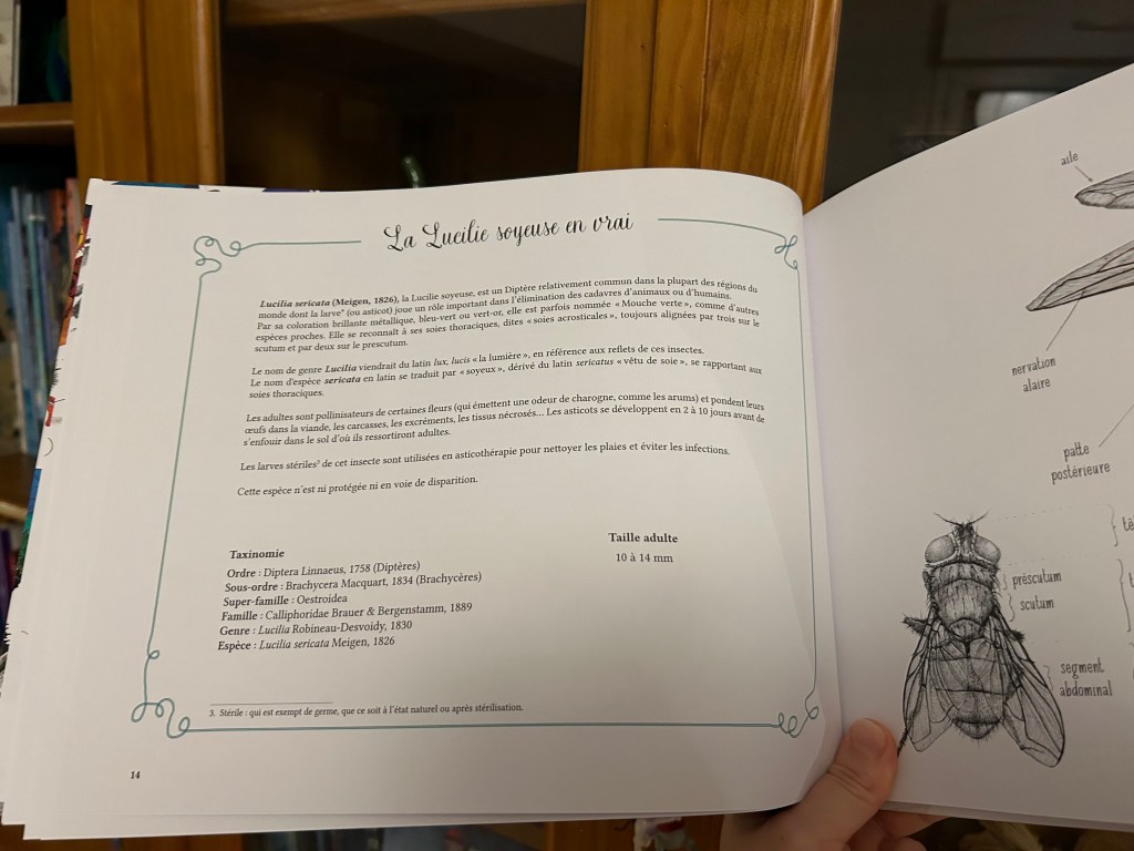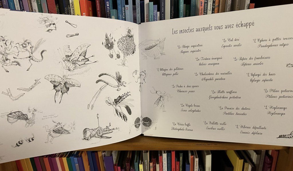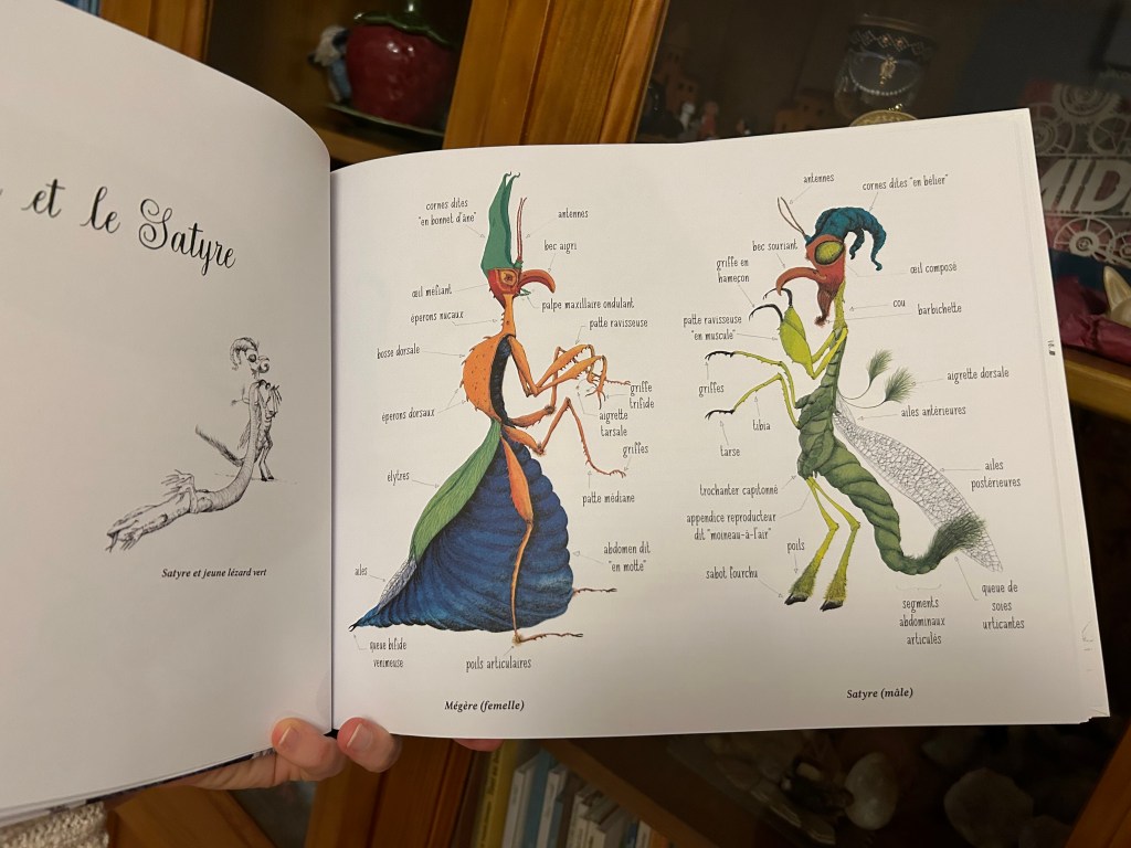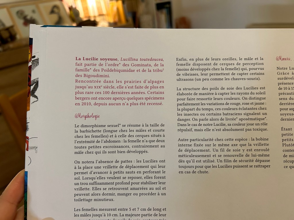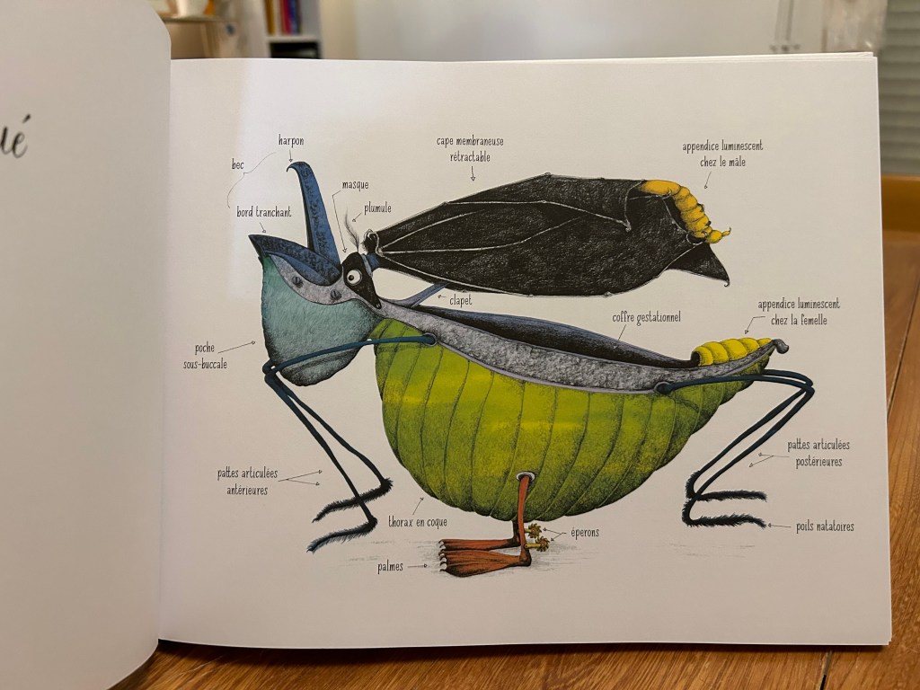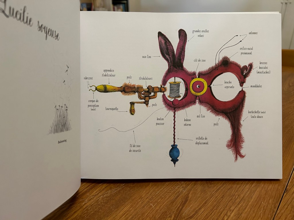 Alors qu’on pourrait s’imaginer plonger dans quelque univers mythologique, Mathilde Magnan choisit la mécanique ! Les planches anatomiques se succèdent, dévoilant les secrets de ces créatures fantastiques. Le grand format coloré laisse place à des croquis révélant nombre d’anecdotes farfelues et rigolotes. Pour parfaire la découverte, des descriptions explicatives des us, coutumes, morphologies et mœurs desdits insectes se déroulent, avant de laisser place à la créature réelle !