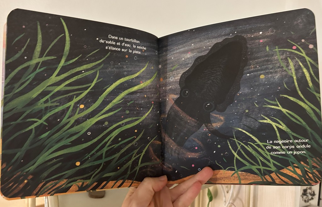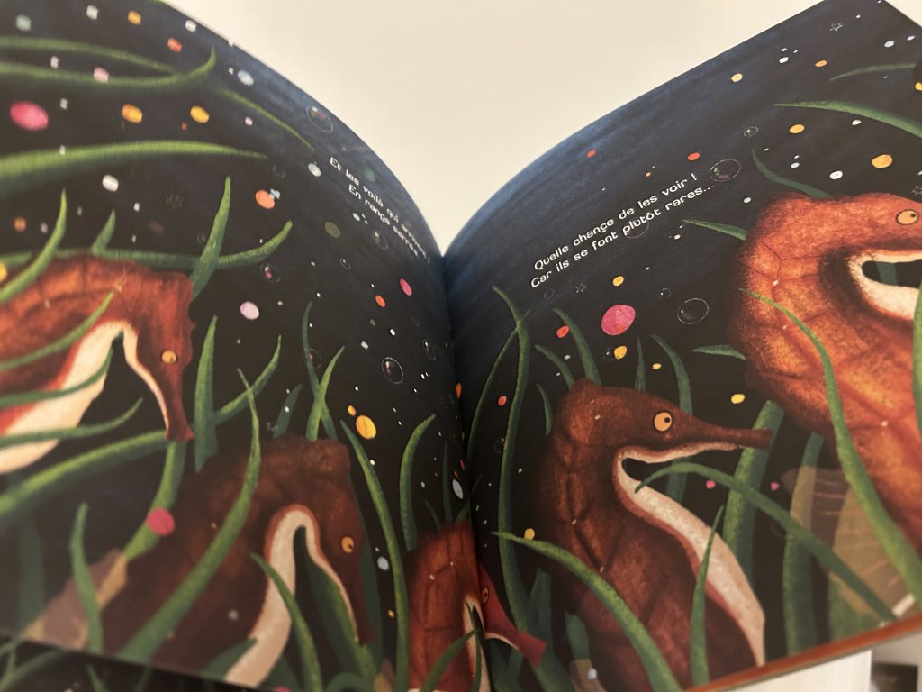 Les véritables stars de l’histoire ce sont ces herbiers marins, alias les zostères et les posidonies. Outre leur rôle de piste de danse, on apprend à la fin de l’ouvrage leur rôle prépondérant d’interface écologique. Il n’y a pas que la faune marine qui bénéficie de leur présence… J’y voie la perspective d’ouvrir échanges et discussions avec les enfants à propos de la biodiversité et quel rôle chacun peut jouer dans sa protection. Dans la mesure où je voue une véritable passion à l’océan, je suis ravie que la marée ait jugé bon de me faire parvenir cet album parfumé aux embruns (breton évidemment) !