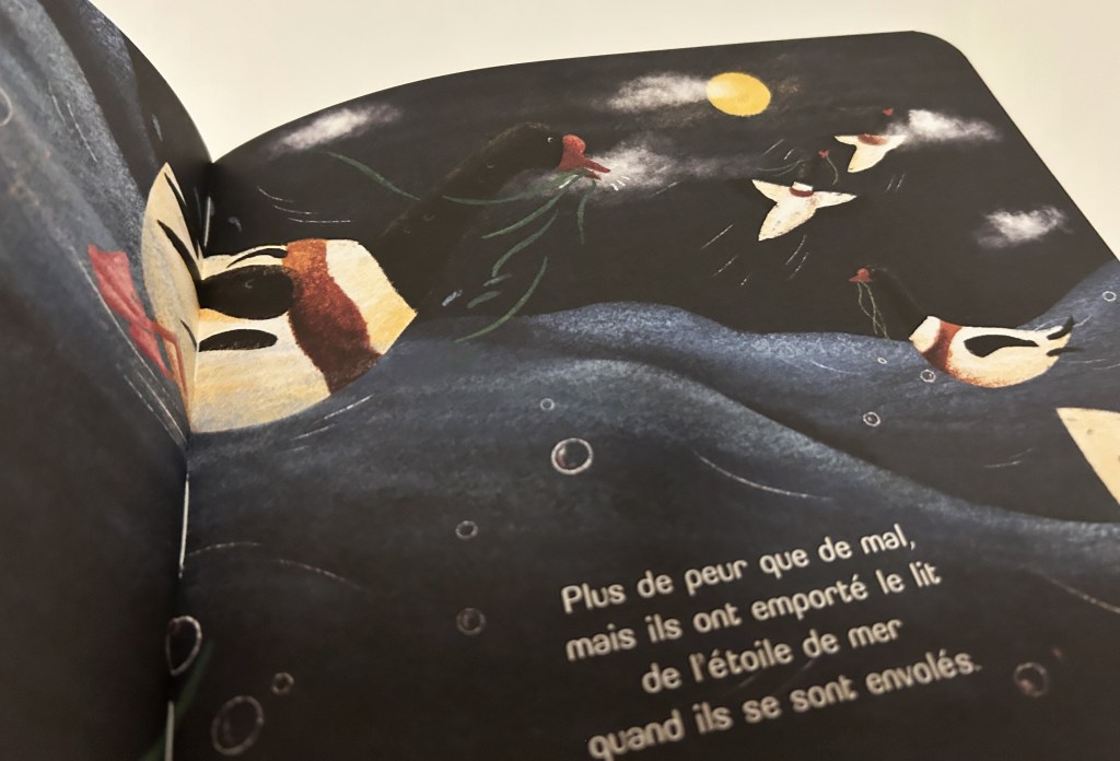 Seule l’étoile de mer reste de marbre : toute cette fête trouble son repos. A moins que ça ne soit la visite des canards gourmands, venus se sustenter dans la prairie au beau milieu de la nuit (il n’y a pas d’heure pour le casse-croûte).