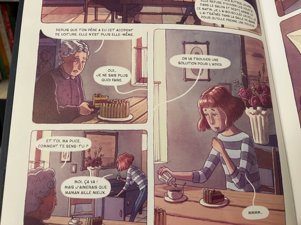 C’est par des bulles tendrement réalistes que Valérie Weishar-Giuliani et Nina Jacqmin nous convient dans la volière aux souvenirs. L’ambiance est celle que l’on trouve quand les volets restent entrouverts. C’est intime, prudent. La pudeur et les silences impriment bien des cases quand ce ne sont pas révolte et colère qui donnent de la voix. Il était temps de briser les murs des non-dits… Si le passé ne peut se réécrire, le présent peut s’auréoler d’une lumière nouvelle. L’espoir est permis et c’est dans le lien, ensemble, que Fantine, Candice et Louison trouveront comment mettre leurs ailes au diapason.