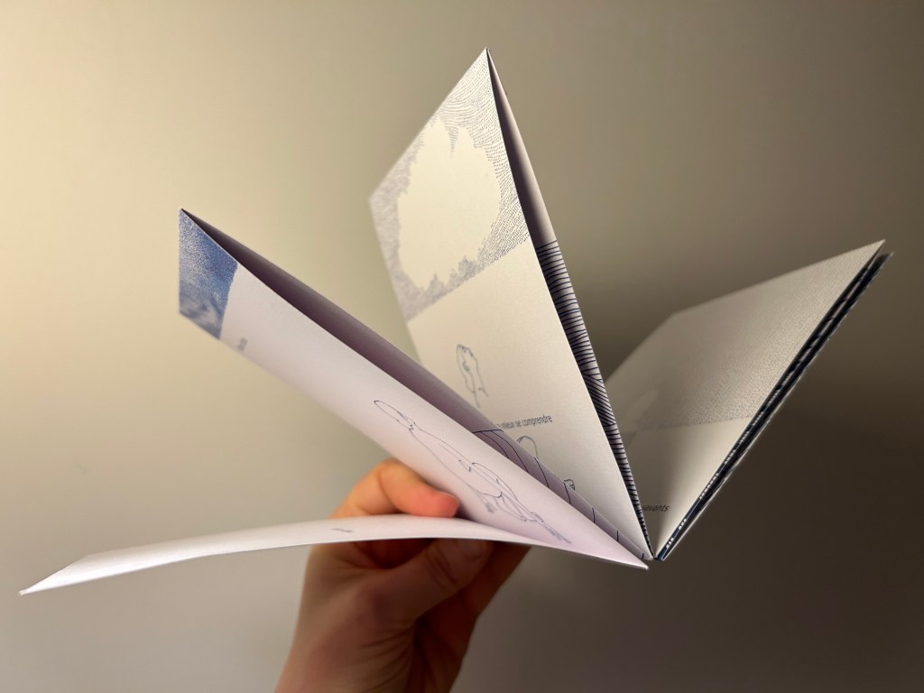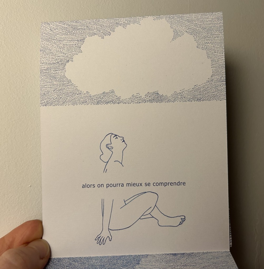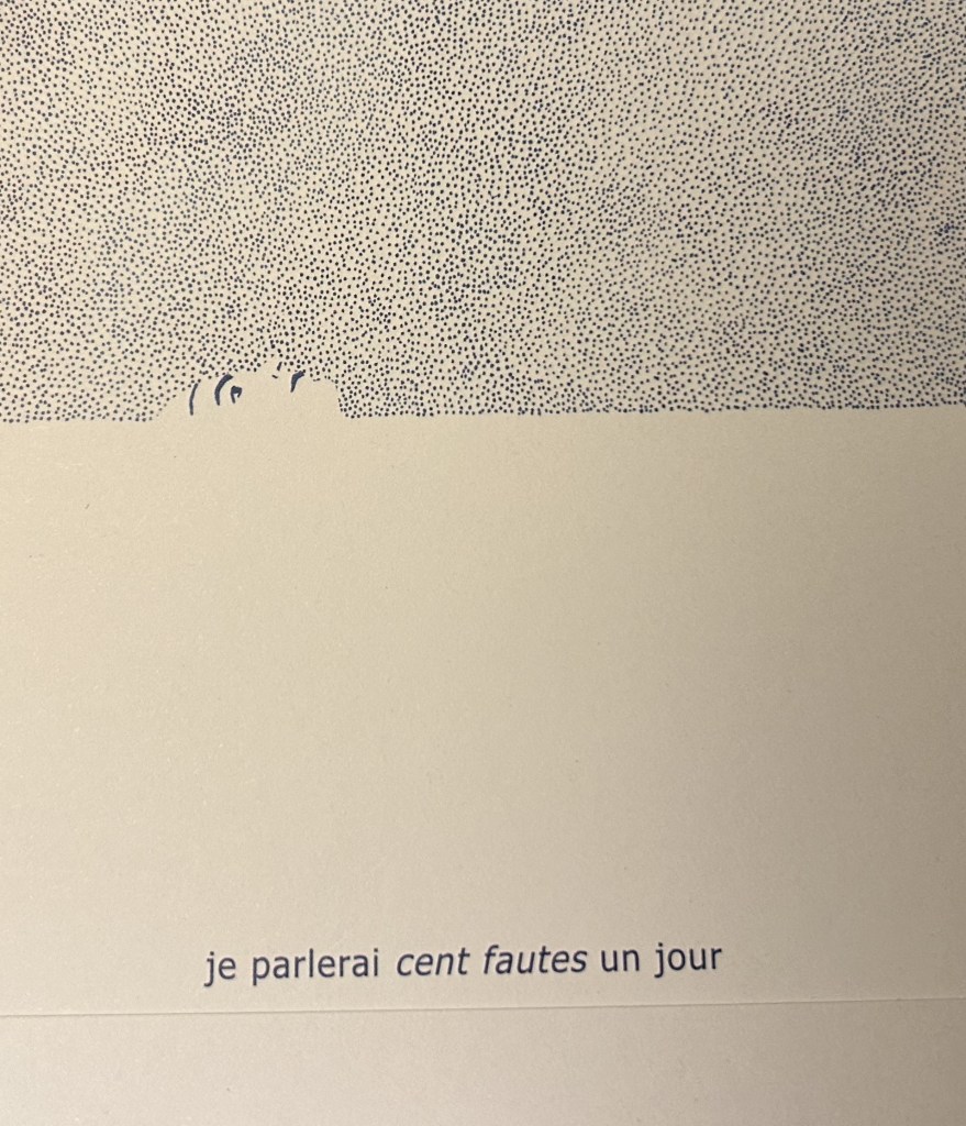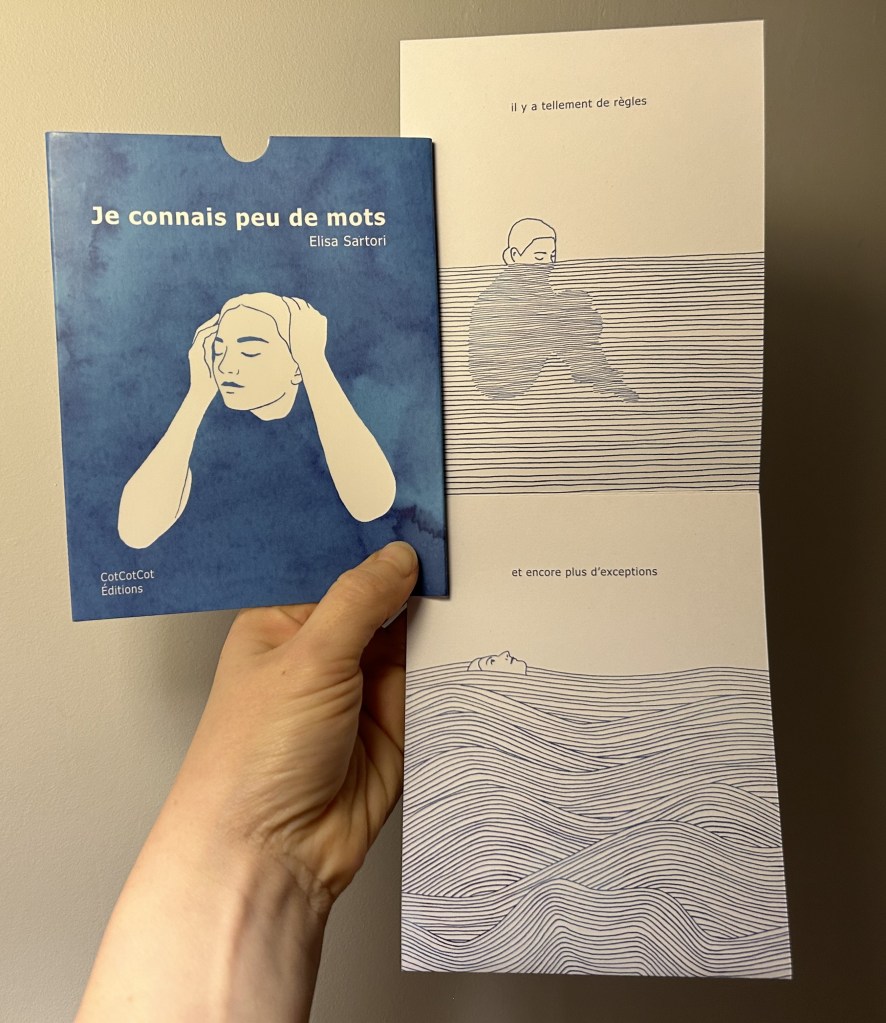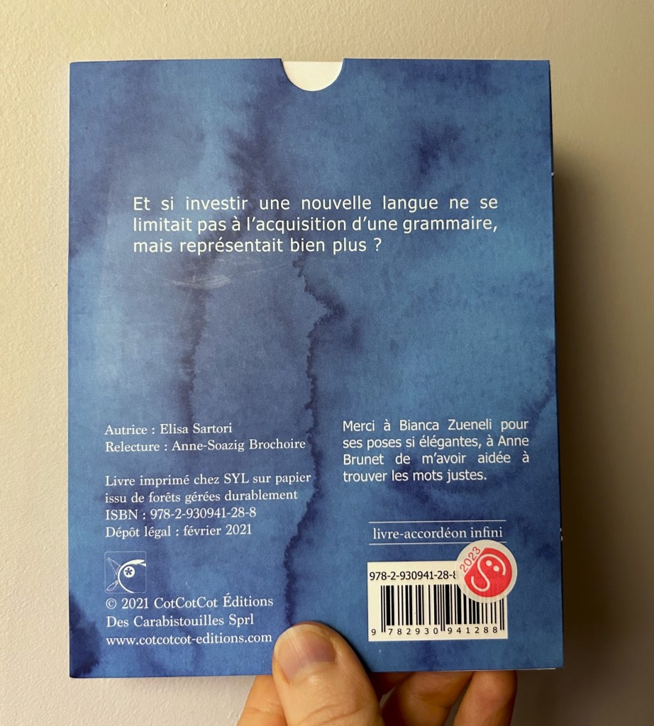 Dans un leporello recto-verso, l’artiste ne donne pas d’indication quant au point de départ de la lecture. L’accordéon de papier parle au présent, à l’infinitif et au futur. Découvrir un nouveau langage c’est baignade, immersion, submersion. C’est aussi découvrir, rencontrer, se tromper pour une finalité : s’enrichir de rencontres.