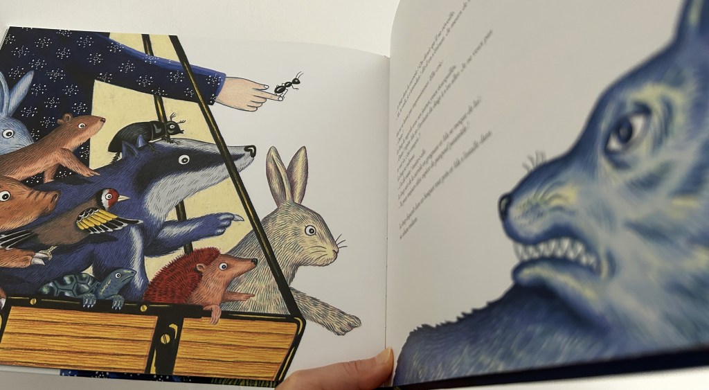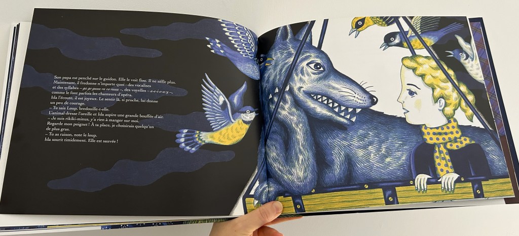 Ida part dans la nuit avec son papa. Ce dernier a une surprise pour elle mais pour la découvrir, il y a un trajet à faire dans la forêt. C’est le soir et dans sa cariole-cabane, les sens d’Ida sont aux aguets. Comme ils sont effrayants tous ces bruits dont on ne distingue pas l’origine. Le loup est proche c’est sûr. Tellement proche qu’il vient s’installer dans la cariole, au nez et la barbe du gentil papa qui ne voit… rien !