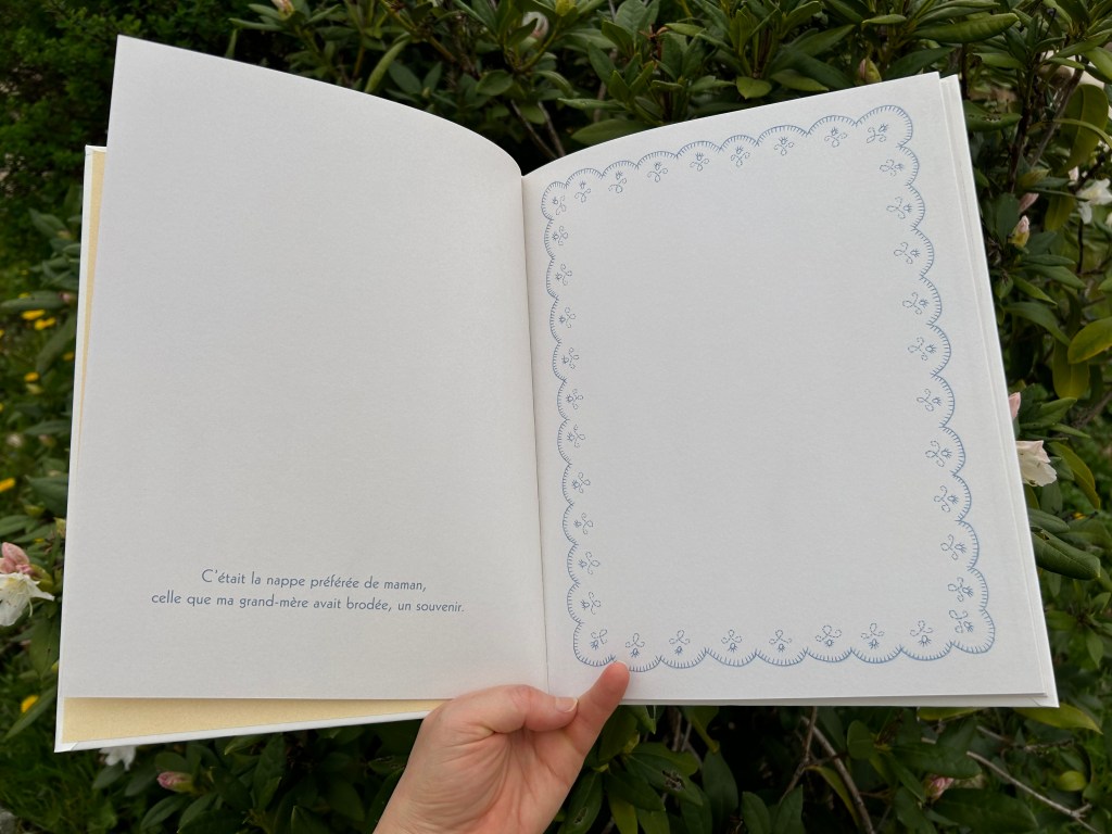 La nappe brodée tisse et entretient le lien entre les différentes générations de cette famille. Elle rassemble, fait vivre l’attachement. Et plus chouette encore : la bévue présente permet à la mère et l’enfant d’ajouter leur signature créative.