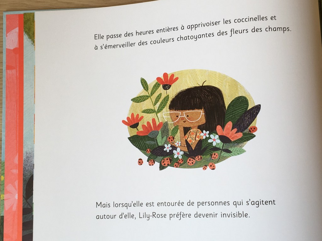 Pour oublier les gens qui se rapprochent d’elle pour mieux regarder, pour ne pas céder à la panique qui monte qui monte, Lily-Rose se concentre sur la demoiselle. Elle l’observe intensément. En même temps, elle ressent la fraîcheur de la brise, ses oreilles capte la musique des cigales et miracle, le calme intérieur revient. Après la stratégie caméléon, la stratégie auto-apaisement (et un peu auto-hypnose…hi hi…magique). Sa voix sort claire et nette quand elle énonce le nom scientifique de son amie. Exit le masque : on peut être discrète sans être dénuée d’assurance. Plutôt que d’acquiescer au qualificatif « timide », Lily-Rose préfère se dire « fleur sauvage », libre, forte et portée par le vent !