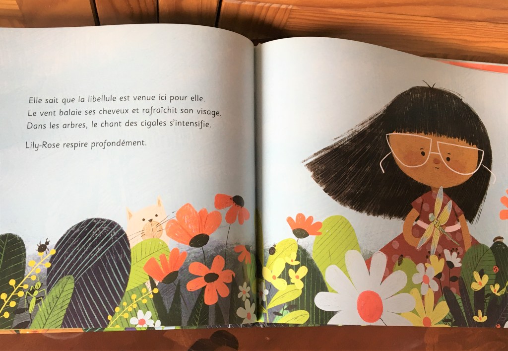 Lily-Rose est une enfant introvertie. Elle ne trouve pas sa place quand il y a du monde. Elle a mis en place une stratégie pour se rendre invisible et éviter de subir de plein fouet la difficulté à prendre une posture en société. Jusque-là ça a marché. Comme elle a développé ses dons d’observatrice, même en présence de beaucoup de gens elle repère LA libellule qui s’est invitée. Dans une société qui valorise l’extraversion, je trouve réconfortant de rencontrer une fillette qui assume son goût pour les ambiances calmes, propices à l’observation des fleurs et du vivant. Je suis ravie que la libellule soit venue se poser sur sa main. Sûrement qu’il y a un peu de communication animale derrière tout ça…